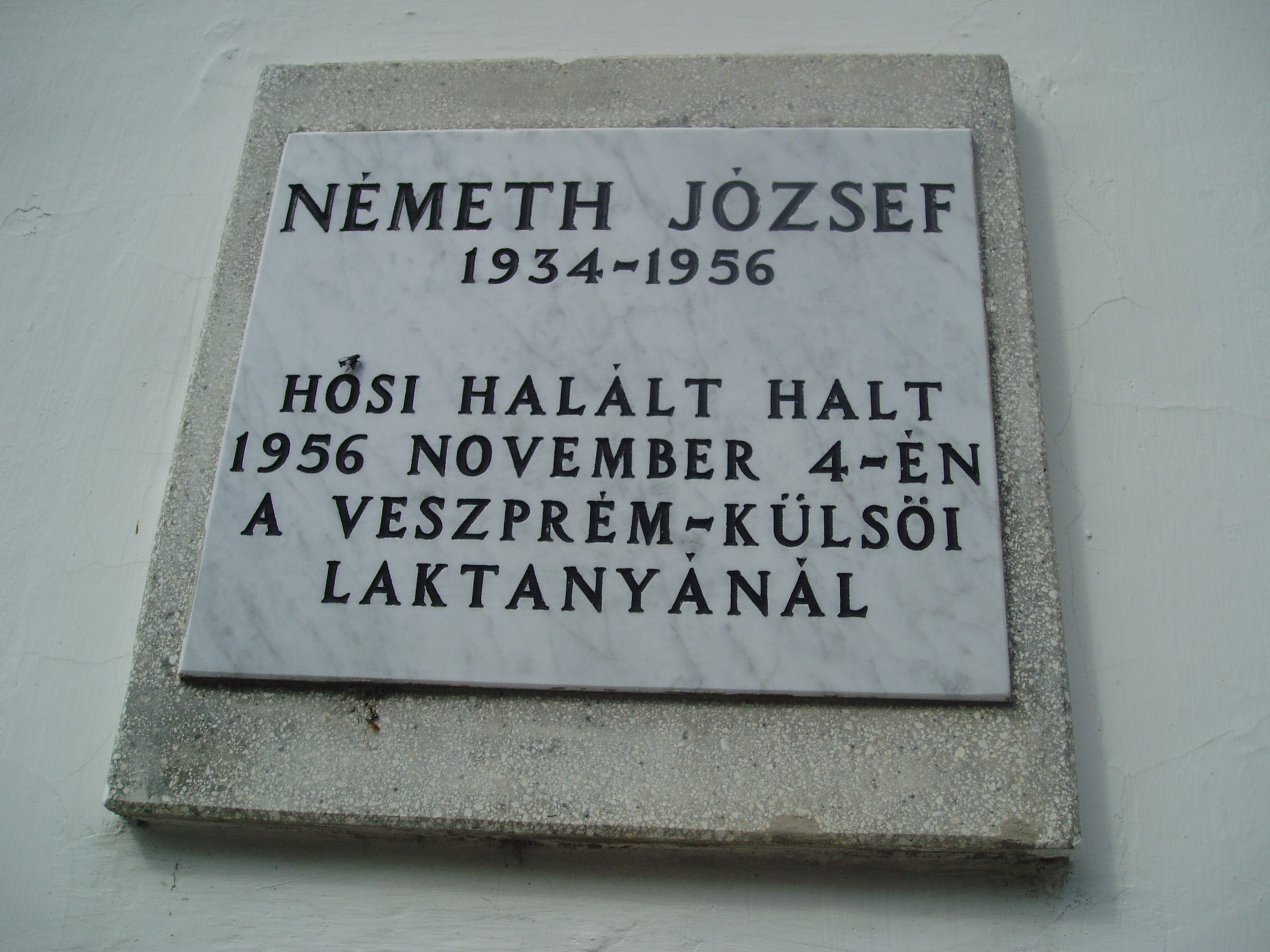 Nyilvános 1104 | 1719 | Sümeg, Panteonfal. Németh József emléktáblája | A Kisfaludy téren, Kisfaludy Sándor szülőháza előtt alakították ki Sümeg Panteonfalát. A képen Németh József (1934-1956) emléktáblája látható. Felirata szerint hősi halált halt 1956. november 4-én a Veszprém-külsői laktanyánál (a Veszprém megyei életrajzi lexikon nem említi). A fénykép 2007 júniusában készült. Felh. irod.: Koppány Tibor - Kozák Károly: Sümeg útikalauz. Veszprém, Idegenforgalmi Hivatal, 1965 Látnivalók Veszprém megyében. Miskolc, Well-PRess, 2004 |