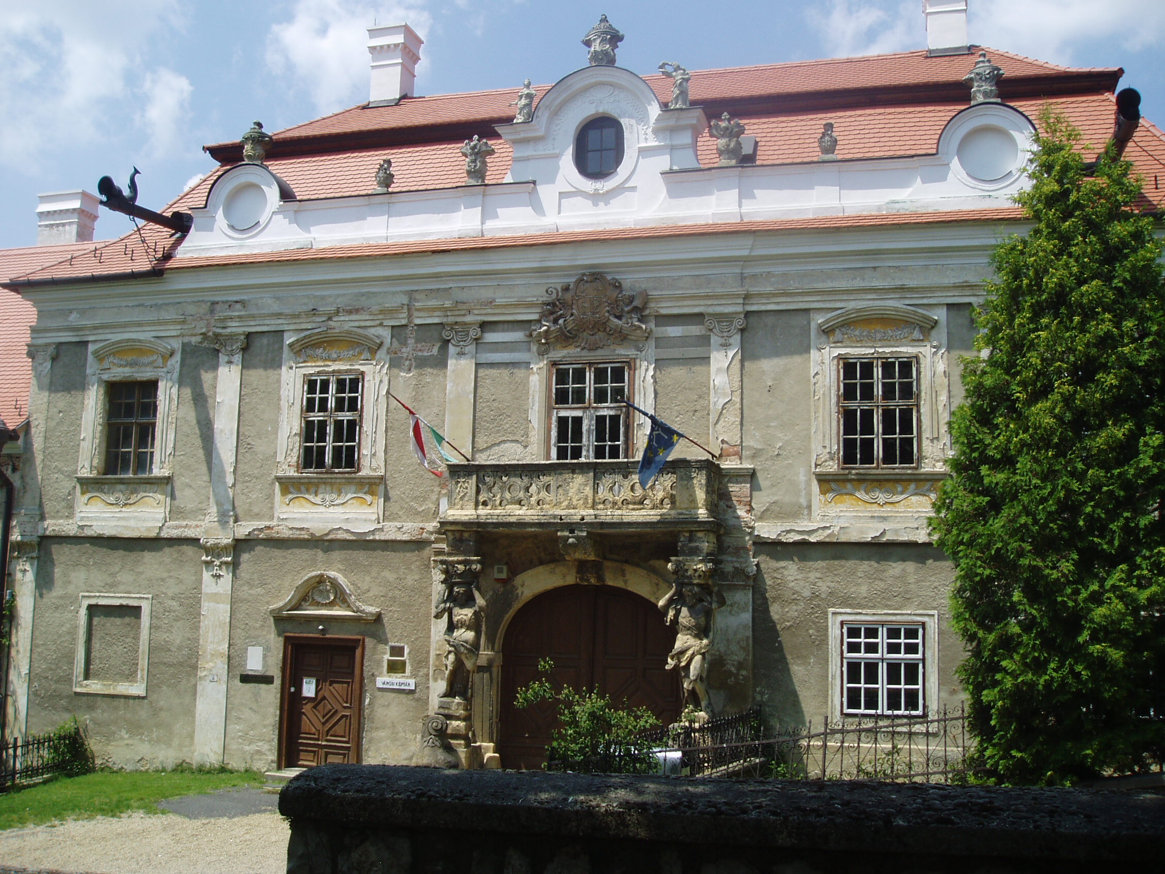 Nyilvános 1070 | 1608 | Sümeg, Szent István tér 10. Püspöki palota | A város egyik legszebb épülete az 1748 és 1755 között emelt püspöki palota. Építtetője Padányi Bíró Márton, aki 1745-ben lett veszprémi püspök, aki élete végéig nagyrészt Sümegről irányította az egyházmgye életét. Sümegen is hunyt el 1762. augusztus 16-án, 67 éves korában. Az épület a domborzati viszonyokat követve egy részében földszintes, nagyobb részében viszont emeletes. Középen a barokk építészet szabályai szerint kiemelt, díszesebb, az íves főkaput tartalmazó épületrész látható. A főkapu felett lévő faragott kőmellvéd erkélyt Atlasz-figurák tartják. A főpárkány alatt helyezték el az építtető püspök gazdagon díszített címerét. Az épület ebédlőjében és kápolnájában a falképek Vogl György, a stukkók Antonio Orsatti 1750-ben készült barokk stílusú alkotásai; a szobák stukkódíszítése és falburkolata szintén barokk stílusú. A palotát 1830 körül klasszicista stílusban átalakították. A fénykép 2007 júniusában készült. Felh. irod.: Koppány Tibor - Kozák Károly: Sümeg útikalauz. Veszprém, Idegenforgalmi Hivatal, 1965 Látnivalók Veszprém megyében. Miskolc, Well-PRess, 2004 Sümegi kalauz. Sümeg, Sümegi Fórum alapítvány, 1993 Hőgyész László: Sümeg évszázadai. Veszprém, 1989 |