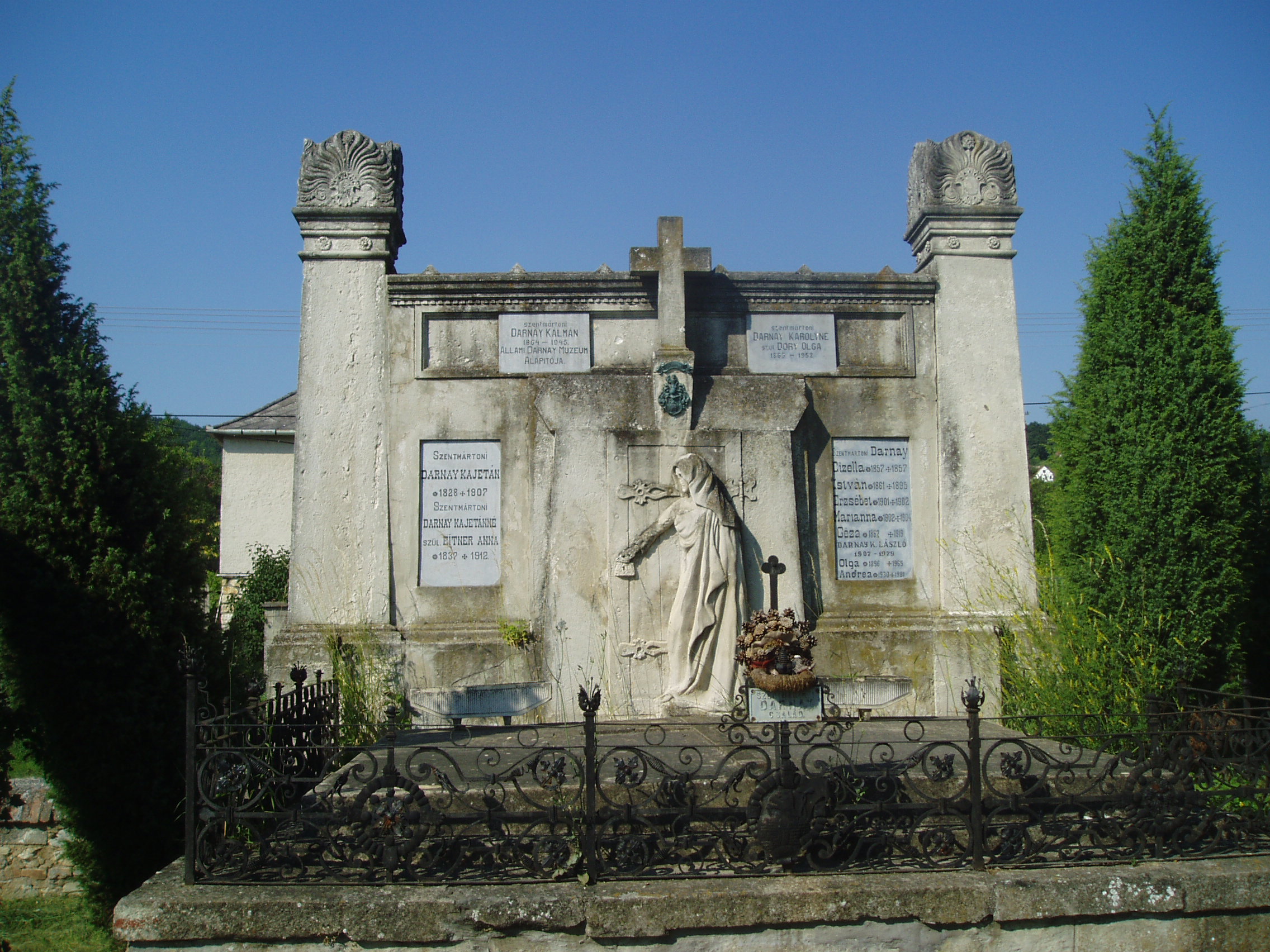 Nyilvános 1162 | 2720 | Sümeg, Temető. Darnay Kálmán sírja | Sümeg délkeleti határában, a Tapolcára vezető út mellett emelkedő lankás domboldalon találjuk a város köztemetőjét. Helyét még Bíró Márton püspök jelölte ki; jelentősebb számban a XIX. század eleje óta kezdtek ide temetkezni. A temetődomb tetején áll az 1816-ban épített, későbarokk stílusú temetőkápolna. Körülötte a sümegi élet utolsó két évszázada szinte valamennyi híres személyiségének sírja fellelhető. Magas kőalapra épített, díszes kovácsoltvassal kerített sírkert a szentmártoni Darnay család temetkezési helye. Itt nyugszik Darnay Kálmán (1864-1945) múzeumalapító, régész, író, aki hosszú évtizedeken át Sümeg társadalmi és kulturális életének egyik legjelentősebb képviselője volt. Darnayt sokat foglalkoztatta Kisfaludy Sándor élete. Közreműködött levelezése kiadásában, múzeumában gazdag gyűjteményt hozott össze a költőre vonatkozó dokumentumokból. 1897-ben a Nemzeti Múzeumnak ajándékozta Kisfaludy Sándor 3600 kötetes könyvtárát. Két regényének is a költő élete a témája (Testőrszerelmek, Elkésett csók). A bujdosó gyöngysor c. munkájában a Balaton- és a Bakony-vidéki várak történetének regényes feldolgozását, a Kaszinózó táblabírákban pedig szülőföldje anekdotáit gyűjtötte csokorba. A család síremlékét Istók János szobrászművész készítette. Az ő alkotása a nőalakot ábrázoló dombormű is. A fénykép 2007 júniusában készült. Felh. irod.: Koppány Tibor - Kozák Károly: Sümeg útikalauz. Veszprém, Idegenforgalmi Hivatal, 1965 Sümegi kalauz. Sümeg, Sümegi Fórum Alapítvány, 1993 Miklósi-Sikes Csaba: Kőbe vésett történelem. A sümegi városi temetők története és sírjelei 1950-ig. Sümeg, Sümegi Fórum Alapítvány, 2002 Veszprém megyei életrajzi lexikon. Veszprém, Veszprém Megyei Önkormányzat Közgyűlése, 1998 |