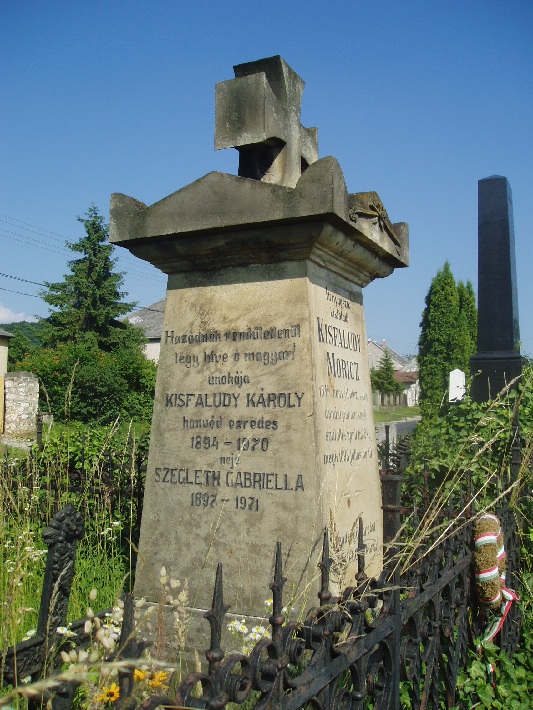 Nyilvános 1106 | 1779 | Sümeg, Temető. Kisfaludy Mór sírja | Sümeg délkeleti határában, a Tapolcára vezető út mellett emelkedő lankás domboldalon találjuk a város köztemetőjét. Helyét még Bíró Márton püspök jelölte ki; jelentősebb számban a XIX. század eleje óta kezdtek ide temetkezni. A temetődomb tetején áll az 1816-ban épített, későbarokk stílusú temetőkápolna. Körülötte a sümegi élet utolsó két évszázada szinte valamennyi híres személyiségének sírja fellelhető. A Tapolcai útra nyíló alsó temetőkapu mellett található Kisfaludy Mór és családja sírkertje. Az empire stílusú sírkő eredetileg Szegedy Róza nyughelyét jelölte. Amikor az 1900-as évek elején egyesítették sírját férjéével, átfaragták sírkövét, s azóta Kisfaludy Mór és családja sírját jelöli. Itt nyugszik Kisfaludy Mór (1814-1893) 1848-as honvéd alezredes, dandárparancsnok, Kisfaludy Sándor unokaöccse. Részt vett az isaszegi, a kápolnai, a pákozdi harcokban, jelen volt Budavár visszafoglalásánál. Aradon halálra ítélték, amit később 16 év várfogságra változtattak. Ismerősei közbenjárására két év múlva kiszabadult, s Sümegre költözött. Véglegesen visszavonult a közélettől, gazdálkodással foglalkozott. Több családtagja is itt van eltemetve. A fénykép 2007 júniusában készült. Felh. irod.: Koppány Tibor - Kozák Károly: Sümeg útikalauz. Veszprém, Idegenforgalmi Hivatal, 1965 Sümegi kalauz. Sümeg, Sümegi Fórum Alapítvány, 1993 Miklósi-Sikes Csaba: Kőbe vésett történelem. A sümegi városi temetők története és sírjelei 1950-ig. Sümeg, Sümegi Fórum Alapítvány, 2002 Veszprém megyei életrajzi lexikon. Veszprém, Veszprém Megyei Önkormányzat Közgyűlése, 1998 |