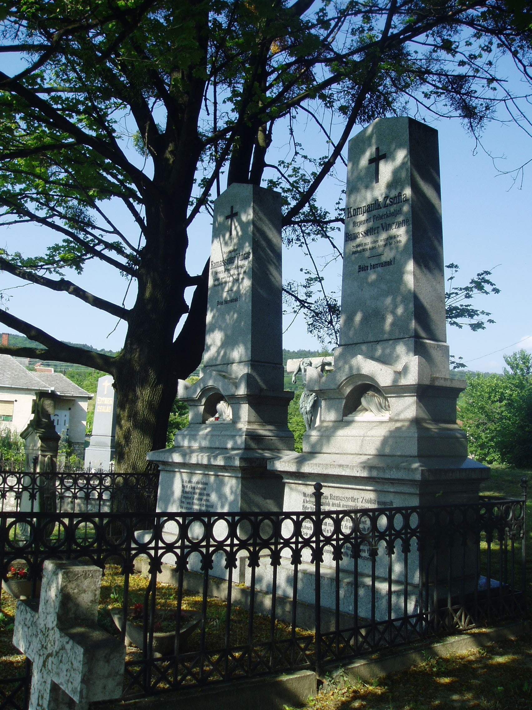 Nyilvános 1111 | 2192 | Sümeg, Temető. Ramassetter Vince sírja | Sümeg délkeleti határában, a Tapolcára vezető út mellett emelkedő lankás domboldalon találjuk a város köztemetőjét. Helyét még Bíró Márton püspök jelölte ki; jelentősebb számban a XIX. század eleje óta kezdtek ide temetkezni. A temetődomb tetején áll az 1816-ban épített, későbarokk stílusú temetőkápolna. Körülötte a sümegi élet utolsó két évszázada szinte valamennyi híres személyiségének sírja fellelhető. Közvetlenül a kápolna előtt magasodik Ramassetter Vince (1806-1878) és felesége, Kompanik Zsófia (1821-1876) kettős, szürke gránitból kifaragott obeliszkje. A Sümeg atyjának is nevezett Ramassetter Vince nevéhez többek között iskolák, óvoda és kórház alapítása fűződik. Nevét és emlékét egészalakos szobor (lásd: Kossuth u. 13.) és több emléktábla is megörökíti a városban (lásd: Árpád u. 5., Deák F. u. 8., Mártirok u. 1., Panteonfal, Rammassetter u. 10.). A fénykép 2007 júniusában készült. Felh. irod.: Koppány Tibor - Kozák Károly: Sümeg útikalauz. Veszprém, Idegenforgalmi Hivatal, 1965 Sümegi kalauz. Sümeg, Sümegi Fórum Alapítvány, 1993 Miklósi-Sikes Csaba: Kőbe vésett történelem. A sümegi városi temetők története és sírjelei 1950-ig. Sümeg, Sümegi Fórum Alapítvány, 2002 Veszprém megyei életrajzi lexikon. Veszprém, Veszprém Megyei Önkormányzat Közgyűlése, 1998 |