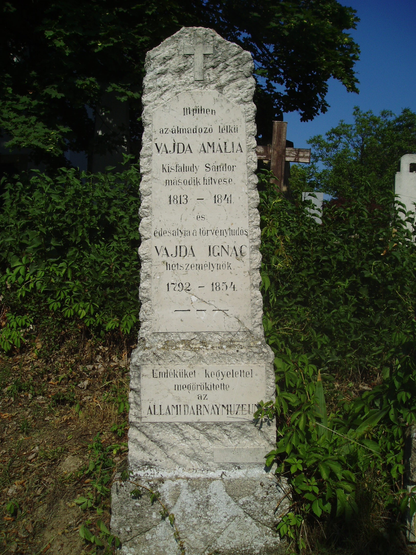 Nyilvános 1128 | 2918 | Sümeg, Temető. Vajda Ignác és Amália sírja | Sümeg délkeleti határában, a Tapolcára vezető út mellett emelkedő lankás domboldalon találjuk a város köztemetőjét. Helyét még Bíró Márton püspök jelölte ki; jelentősebb számban a XIX. század eleje óta kezdtek ide temetkezni. A temetődomb tetején áll az 1816-ban épített, későbarokk stílusú temetőkápolna. Körülötte a sümegi élet utolsó két évszázada szinte valamennyi híres személyiségének sírja fellelhető. A temetőkápolna közelében nyugszik Vajda Ignác (1792-1854) hétszemélynök, több jogi kézikönyv szerzője és fiatalon elhunyt leánya, Vajda Amália (1813-1841), Kisfaludy Sándor költő második felesége 1834-1841 között. A fénykép 2007 júniusában készült. Felh. irod.: Koppány Tibor - Kozák Károly: Sümeg útikalauz. Veszprém, Idegenforgalmi Hivatal, 1965 Sümegi kalauz. Sümeg, Sümegi Fórum Alapítvány, 1993 Miklósi-Sikes Csaba: Kőbe vésett történelem. A sümegi városi temetők története és sírjelei 1950-ig. Sümeg, Sümegi Fórum Alapítvány, 2002 Veszprém megyei életrajzi lexikon. Veszprém, Veszprém Megyei Önkormányzat Közgyűlése, 1998 |