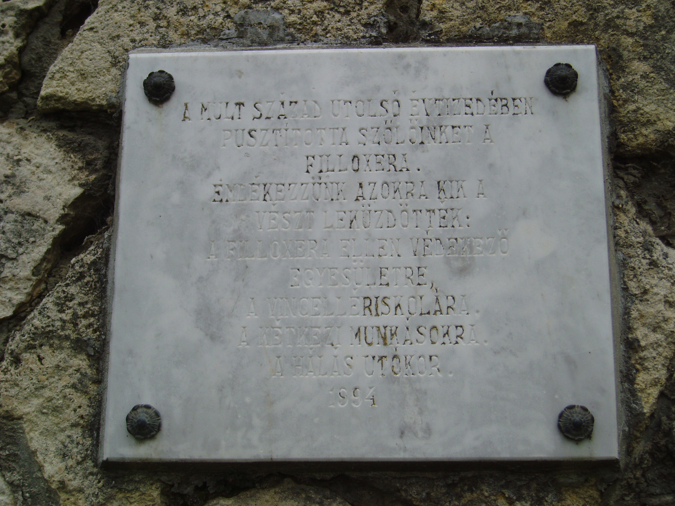 Nyilvános 1044 | 1708 | Tapolca, Városi Panteonfal: a filoxéra elleni küzdelem emléktáblája | A Malom-tó mögött álló magas kőfal a Városi Panteonfal, amelyen több neves, tapolcai kötődésű személyiségnek állítottak emléktáblát. Az emléktáblát a XIX. század utolsó évtizedében a szőlőt pusztító filoxéra leküzdői emlékére - a Filoxéra Ellen Védekező Egyesület, a Vincellériskola és a névtelen kétkezi munkások - emlékére 1994-ben avatták fel. A felvétel 2007 februárjában készült. Felh. irod.: Bándi László: Emlékhelyek Veszprém megyében. Veszprém, 1996 www.tapolca.hu |