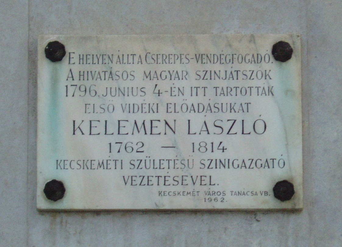 Nyilvános 1221 | 2056 | Kecskemét, Piaristák tere 7. | Az 1950-ben épült kocka alakú, háromszintes SZTK rendelőintézet helyén az 1773–1776 között épített Arany Sas vendégfogadó állott, amelyet a kecskemétiek csak Cserepes néven emlegettek. Udvari fészerében a XVIII. század legvégén alkalmi színpadot alakítottak ki, itt szerepeltek először a városban hivatásos magyar színjátszók, az Első Magyar Játékszíni Társaság. Vezetőjük a kecskeméti születésű Kelemen László volt. Kelemen Lászlóék első kecskeméti előadását Liszka Béla helybeli főreáliskolai tanár keltezte 1796-ra. Újabb vélemények szerint azonban az első hivatásos magyar nyelvű színtársulat csak 1800 nyarán lépett fel Kecskeméten. 1800-ban még Kelemen társulatának tagja volt a szintén kecskeméti születésű és az 1780-as években a piarista gimnáziumban (lásd: Kecskemét, Jókai u. 1.) diákoskodott Szerelemhegyi András, aki színészként és/vagy zenei mindenesként valószínűleg közreműködött a „Cserepes” udvarán megtartott előadásokon. Az Arany Sas fogadóban kecskeméti tanulmányainak megkezdésekor megszállt Jókai Mór, 1857-es országjárása idején pedig Ferenc József és felesége, Erzsébet királyné. Később az épület járásbíróság, majd kórház lett. 1948-ban lebontották s két év múlva emelték helyére a ma is álló épületet. A rendelőintézet Piaristák terére néző falán 1962-ben emléktáblát helyeztek el. A fénykép 2006 augusztusában készült. Felh. irod.: Heltai Nándor: Kecskemét. Kecskeméti Lapok, 1998 Bács-Kiskun megyei történeti és kegyeleti emlékhelyek számbavétele. Kecskemét, 1989. Birck Edit: A Duna–Tisza köze irodalmi országútjain. = Honismeret 2001. 3. |