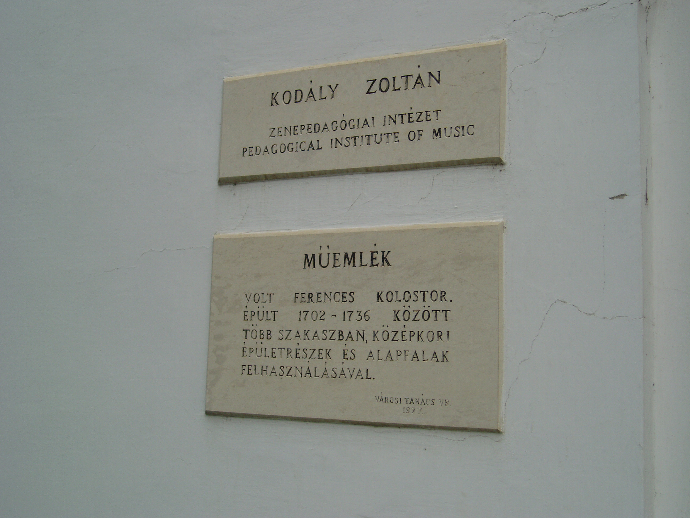 Nyilvános 1110 | 1708 | Kecskemét, Kéttemplomköz 1. Kodály Intézet | A kecskeméti születésű Kodály Zoltán zenepedagógiai törekvéseit és nevelési rendszerét az egész világra kisugárzó Kodály Zoltán Zenepdagógiai Intézet otthona középkori épületrészek és alapfalak felhasználásával ferences kolostornak épült 1702–1736 között. Az épületet Kerényi József tervei szerint 1975-ben alakították át az újonnan alapított Kodály Intézet céljaira. A ragyogó átalakítás az új intézmény igényeit és a műemléki környezet minél teljesebb megóvását egyaránt figyelembe vette. Az 1980-as évek elején — ugyancsak Kerényi József tervei alapján — új szárnnyal bővítették, amely irodáknak, tantermeknek, a zenei szakkönyvtárnak és az audiovizuális stúdiónak ad helyet. Mint az intézmény honlapján is olvasható, a Kodály Intézet a magyar zenepedagógia világszerte ismert és elismert műhelye. Kodály zenei nevelési koncepciójának elméleti és gyakorlati oktatására továbbképzéseket szervez magyar zenetanárok, valamint éves tanfolyamokat külföldi szakemberek számára. A földszinti folyosókon a nagyközönség számára is látogatható állandó Kodály–kiállítást rendeztek, amelyet alkalmankét időszaki tárlatok egészítenek ki. A kolostor egykori refektóriuma ma kiváló akusztikájú hangversenyterem. A kerengő által közrefogott belső udvaron is gyakran rendeznek nyári koncerteket. A fénykép 2006 augusztusában készült. Felh. irod.: Heltai Nándor: Kecskemét. Kecskeméti Lapok, 1998 www.kodály-inst.hu |