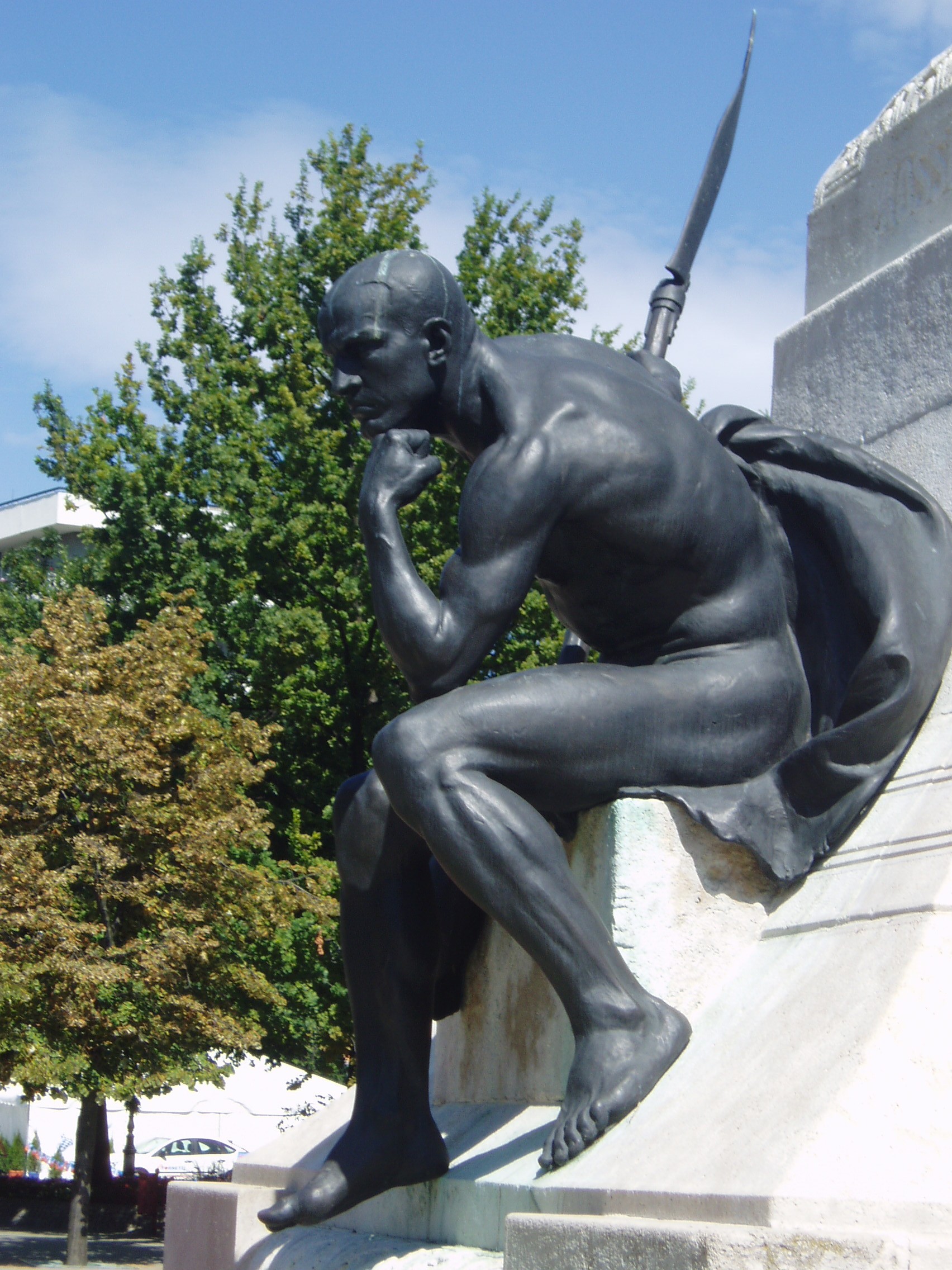 Nyilvános 1147 | 1959 | Kecskemét, Kossuth tér: Kossuth Lajos szobra, mellékalak | Kossuth Lajos 2 és fél méter magas bronzszobrát, Telcs Ede alkotását 1906-ban avatták fel Kecskemét központjában. Az alkotás az 1848/49-es forradalom és szabadságharc emléke mellett Kossuth 1848. szeptember 25-én — ugyanezen a helyen, az akkori régi vásártéren — elmondott toborzó beszédét is felidézi. A szobor ülő mellékalakja kiegyenesített kaszát tart a kezében. E mellékalakról maga a szobrász mondta, hogy ugyan Rodin: Gondolkodó című híres szobrához nagyon hasonló pózban ül, de megfeszített izmokkal, készen rá, hogy ha Kossuth „mégegyszer azt üzeni”, a kezében tartott kiegyenesített kaszával rögtön rámenjen az osztrákra. A helyi hagyomány szerint e mellékalak modellje Kacsóh Pongrác, a János vitéz alapján írt daljáték zeneszerzője volt. A fénykép 2006 augusztusában készült. Felh. irod.: Heltai Nándor: Kecskemét. Kecskeméti Lapok, 1998 Orosz Andrea: Kiskunság és Felső-Bácska. Bp. Frigoria, 2004 |
