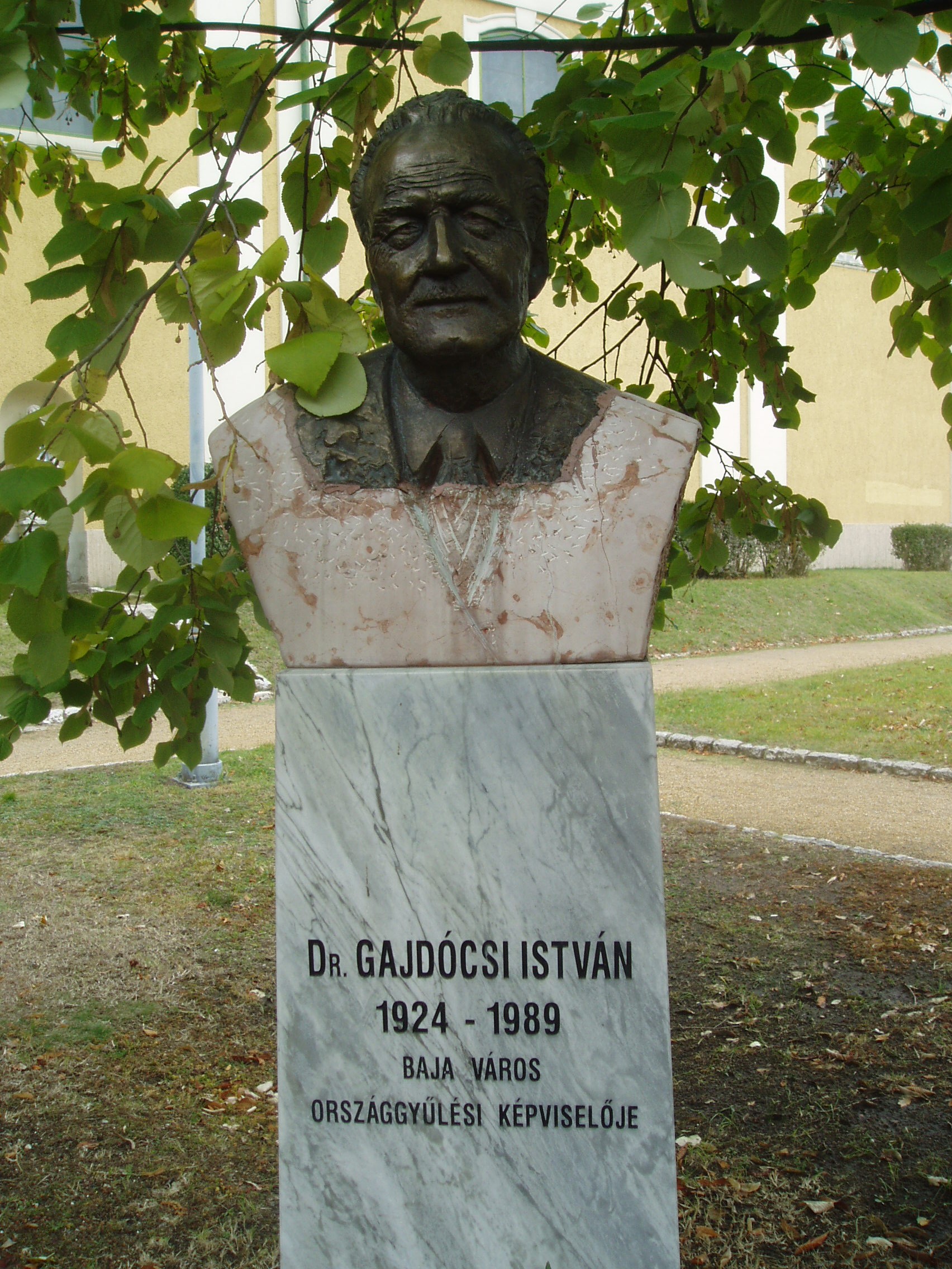 Nyilvános 1446 | 3173 | Baja, Bartók Béla utca 1-3. Páduai Szent Antal ferences kolostortemplom és rendház | Baja központjában áll az egykori ferences rendház, s hozzá tapadva a kolostortemplom, más néven Barátok temploma. A templom déli oldalán levő parkban híres bajai személyiségek mellszobrait állították fel. Itt áll Gajdócsi István mellszobra is, aki a Kádár-korszakban Bács-Kiskun megye tanácselnöke és Baja országgyűlési képviselője volt, s a térség kulturális és művészeti életét jelentősen támogatta. A fénykép 2007 októberében készült. Felh. irod.: Látnivalók Bács-Kiskun megyében. Miskolc, Well-PRess, 2002 www.wikipedia.org |