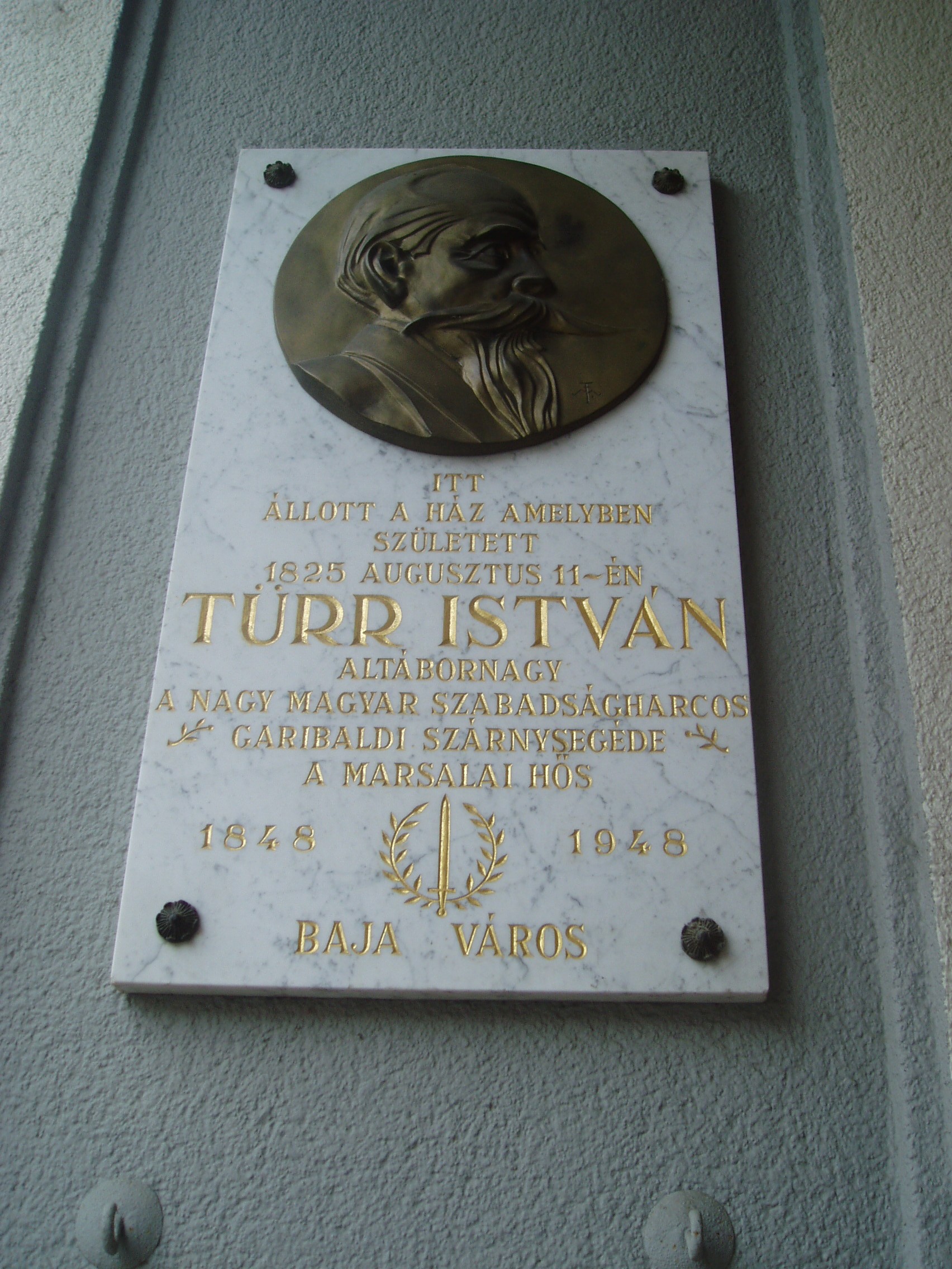 Nyilvános 1500 | 3073 | Baja, Bartók Béla utca 10. | Mint az épület homlokzatán elhelyezett emléktáblán is olvasható, egykor itt állott az a ház, amelyben született 1825. augusztus 11-én Türr István, a nagy magyar szabadságharcos, Garibaldi szárnysegéde, a marsalai hős. Apja Türr Jakab, anyja Udvary Terézia volt. Iskoláit szülővárosában végezte barátjával, Tóth Kálmán költővel együtt. Fiatalon beállt katonának, a császári hadseregben Ferenc Károly főherceg ezredében szolgált. Az 1848. évi olasz forradalom kitörésekor Radeczky seregével hadnagyi rangban Olaszországba került. 1849. január 19-én megszökött a seregből, és piemonti területre jutott, ahol egy alakuló magyar légió parancsnokságát vette át. A novarai vereség hallatán azonban csapata feloszlott, ő maga Badenba utazott, ahol a forradalmi seregben ezredes lett. A forradalmat azonban itt is leverték, és Türr Svájcba menekült. Ott értesült a világosi fegyverletételről, ekkor hosszabb tartózkodásra Londonba költözött. A krími háború kitörésekor belépett az angol seregbe, ahol magas rendfokozatot kapott. 1855 végén az angol kormány megbízásából a dunai tartományokba utazott, ahol egy volt tiszttársa feljelentése nyomán elfogták, Bécsbe vitték, ahol a hadbíróság halálra ítélte, s csak Viktória királynő közbenjárására bocsátották szabadon. 1856-ban Törökországba ment, részt venni a cserkesz háborúban az oroszok ellen. 1859-ben, amikor kitört az olasz függetlenségi harc, több honfitársával együtt Türr is odasietett, hogy az Ausztria elleni háborúban részt vegyen. Itt Giuseppe Garibaldi mellett szolgált. A villafrancai béke után ismét Garibaldi mellé állt mint annak hadsegéde, s egyike volt a „halhatatlan ezrednek”, amely végül bevette Palermót. Palermo bevétele leginkább Türr tanácsai miatt sikerült, ezért Garibaldi a nemzetőrség főfelügyelőjévé és tábornokká nevezte ki. Harcban szerzett sebesülése miatt egy ideig a hadsereg további szervezésén fáradozott, majd döntő szerepe volt a messinai ütközetben aratott győzelemben is. Nápoly bevétele után Garibaldi a város polgári és katonai kormányzójává nevezte ki. A hadjárat után az olasz kormány megerősítette altábornagyi rangját, és kinevezte őt Viktor Emmanuel szárnysegédjévé, ezáltal sok kényes diplomáciai ügy elintézését bízták rá. 1861. szeptember 10-én Mantovában feleségül vette III. Napóleon unokahúgát, Wyse-Bonaparte Adélt Az általános amnesztia után visszatért Magyarországra, és itt a közügyekben élénken részt vett, s közben politikai missziókat is teljesített: 1870-ben, bár nem hivatalosan, sokat fáradozott a francia, olasz és osztrák–magyar szövetség létrehozása körül. Élete alkonyán legtöbb idejét Párizsban töltötte, több olasz királyi rend nagykeresztes vitéze volt. Mind a mai napig róla van elnevezve a palermói laktanya. A fénykép 2007 októberében készült. Felh. irod.: www.wikipedia.org |