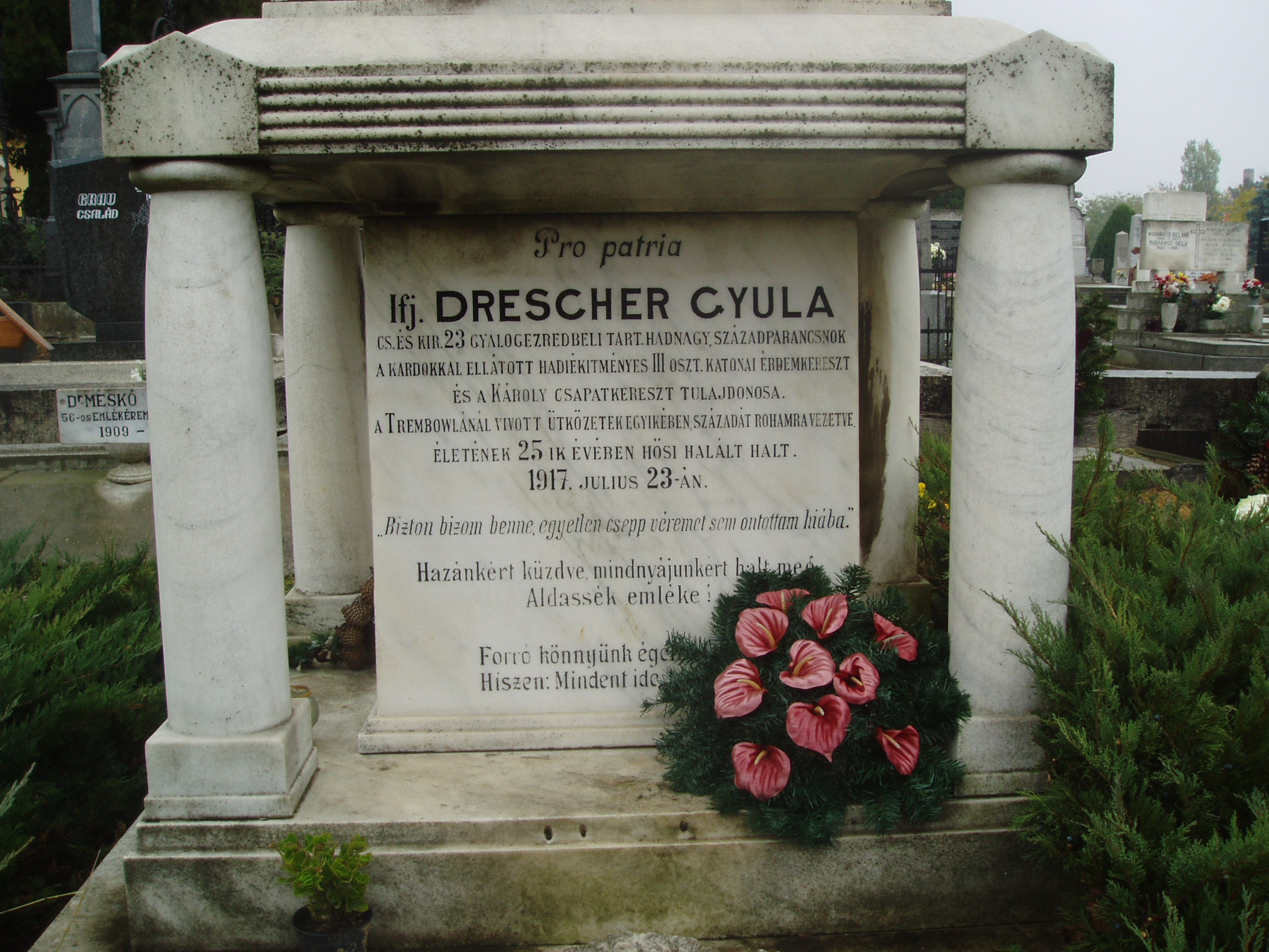 Nyilvános 1126 | 2178 | Baja, Rókus utva: Rókus temető - Drescher Gyula sírja | Itt nyugszik ifj. Drescher Gyula, a 23. gyalogezred tartalékos hadnagya, századparancsnok. Hősi halált halt életének 25. évében, 1917. november 23-án. A fénykép 2007 októberében készült. |