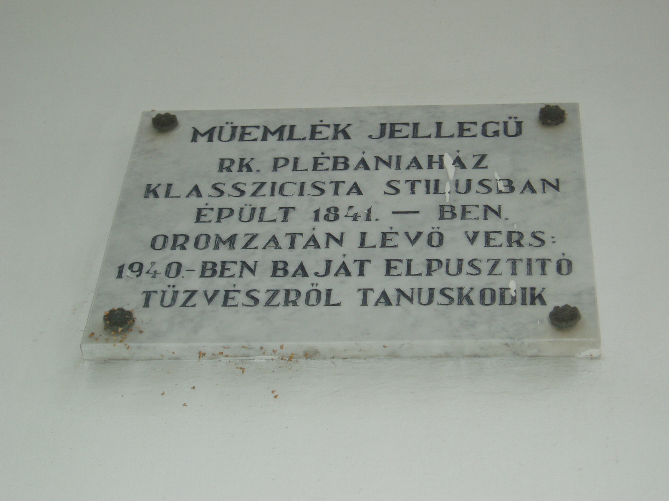 Nyilvános 1079 | 1494 | Baja, Szent Imre tér 6. R. k. plébániaház | A műemlék jellegű római katolikus plébániaház klasszicista stílusban épült újjá 1841-ben. Az oromzatán olvasható kronosztikonon a várost porig égető 1840. május 1-jei tűzvész napját örökítették meg. A tűzvész során elpusztult 1282 lakóház, 812 melléképület, 5 templom, a zsinagóga és a kórház, s 46 ember halt meg a tűzben. 1957 és 1962 között itt élt dr. Belon Gellért (1911-1987) plébános, későbbi pécsi püspök. A fénykép 2007 októberében készült. Felh. irod.: www.vendegvaro.hu |