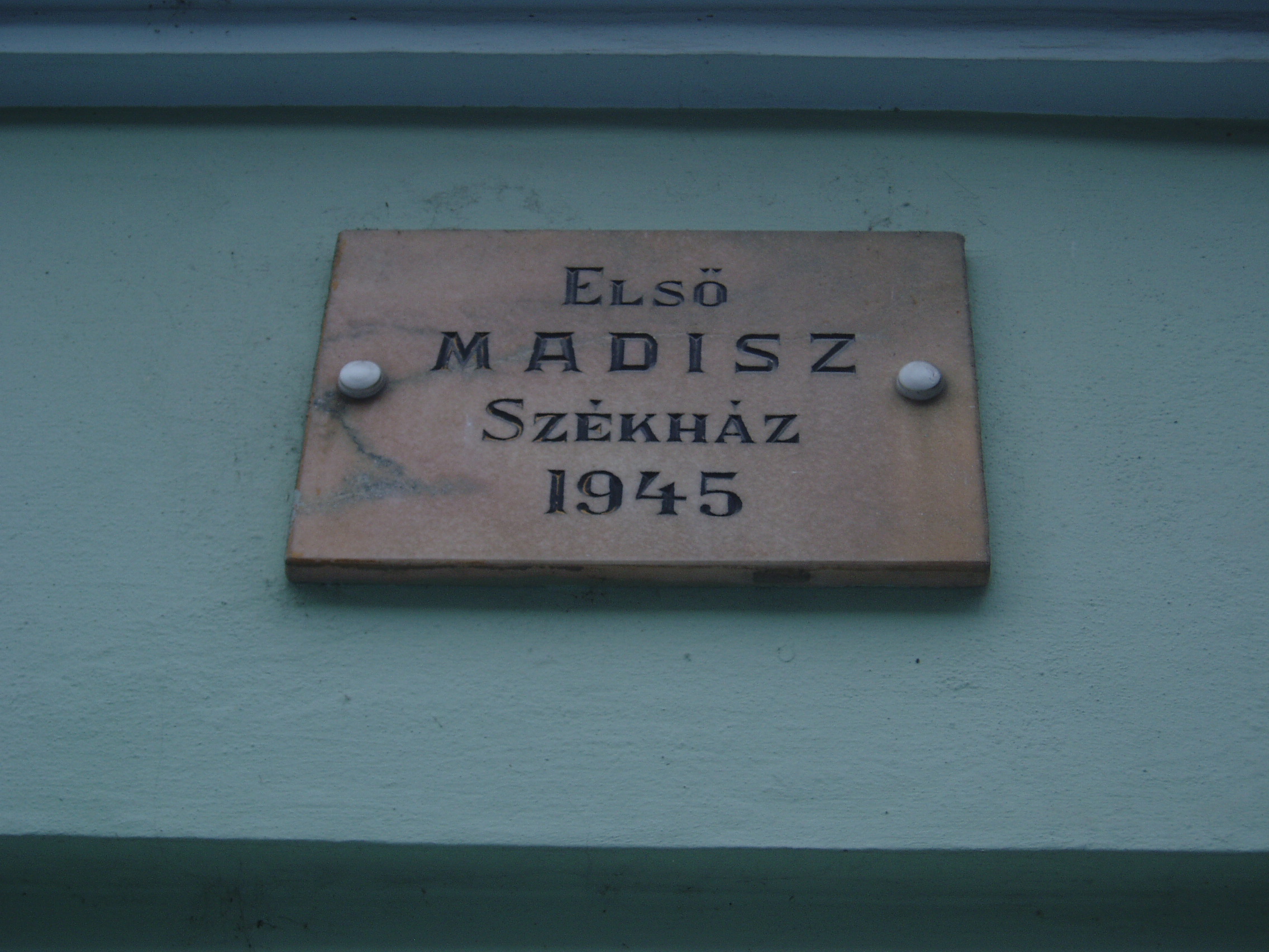 Nyilvános 1126 | 1577 | Baja, Vörösmarty utca 4. | Ebben a házban volt a bajai MADISZ első otthona 1945-ben. A Magyar Demokrata Ifjúsági Szövetség a párton kívüli 15-24 éves ifjúságot tömörítő tömegszervezet volt. Az MKP kezdeményezésére és javaslatára Szegeden 1944. december 31-én alakult meg. 1950-ben beolvadt a DISZ-be (Dolgozó Ifjúság Szövetsége), amelyből 1957. március 21-én Magyar Kommunista Ifjúsági Szövetség (KISZ) néven alakult meg a párt vezetése alatt az új ifjúsági tömegszervezet. A fénykép 2007 októberében készült. Felh. irod.: Politikai kisszótár. Bp. Kossuth Könyvkiadó, 1986 |
