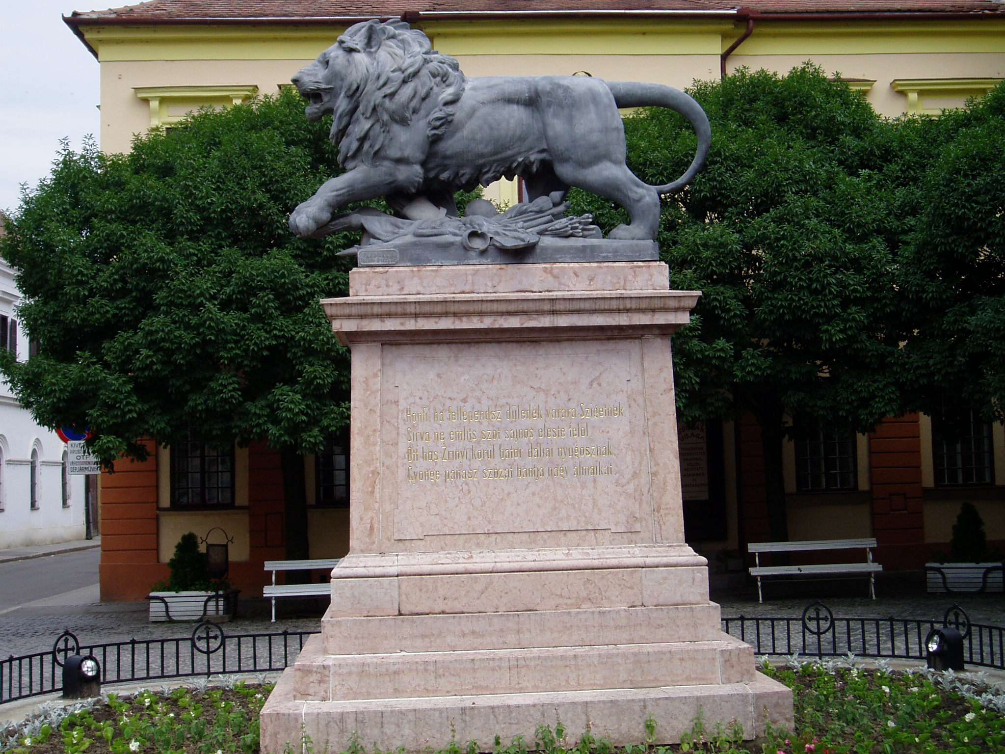 Nyilvános 1187 | 2044 | Szigetvár, Zrínyi tér: Oroszlános emlékmű | Zrínyi Miklós és a szigetvári hősök tiszteletére 1878-ban állították fel a Zrínyi tér északi részén az ún. oroszlános emlékművet. A szobor talapzatán Vörösmarty Mihály sorai olvashatók: "HONFI, HA FELLÉPENDSZ DÜLEDÉK VÁRÁRA SZIGETNEK, / SÍRVA NE EMLÍTS SZÓT SAJNOS ELESTE FELŐL, / OTT HŐS ZRÍNYI KÖRÜL BÁTOR DALIÁK NYUGOSZNAK, / GYÖNGE PANASZ SZÓZAT BÁNTJA NAGY ÁLMAIKAT." A fénykép 2005 júniusában készült. Felh. irod.: Látnivalók Pécsett és Baranyában. Miskolc, Well-PRess, 1998 |