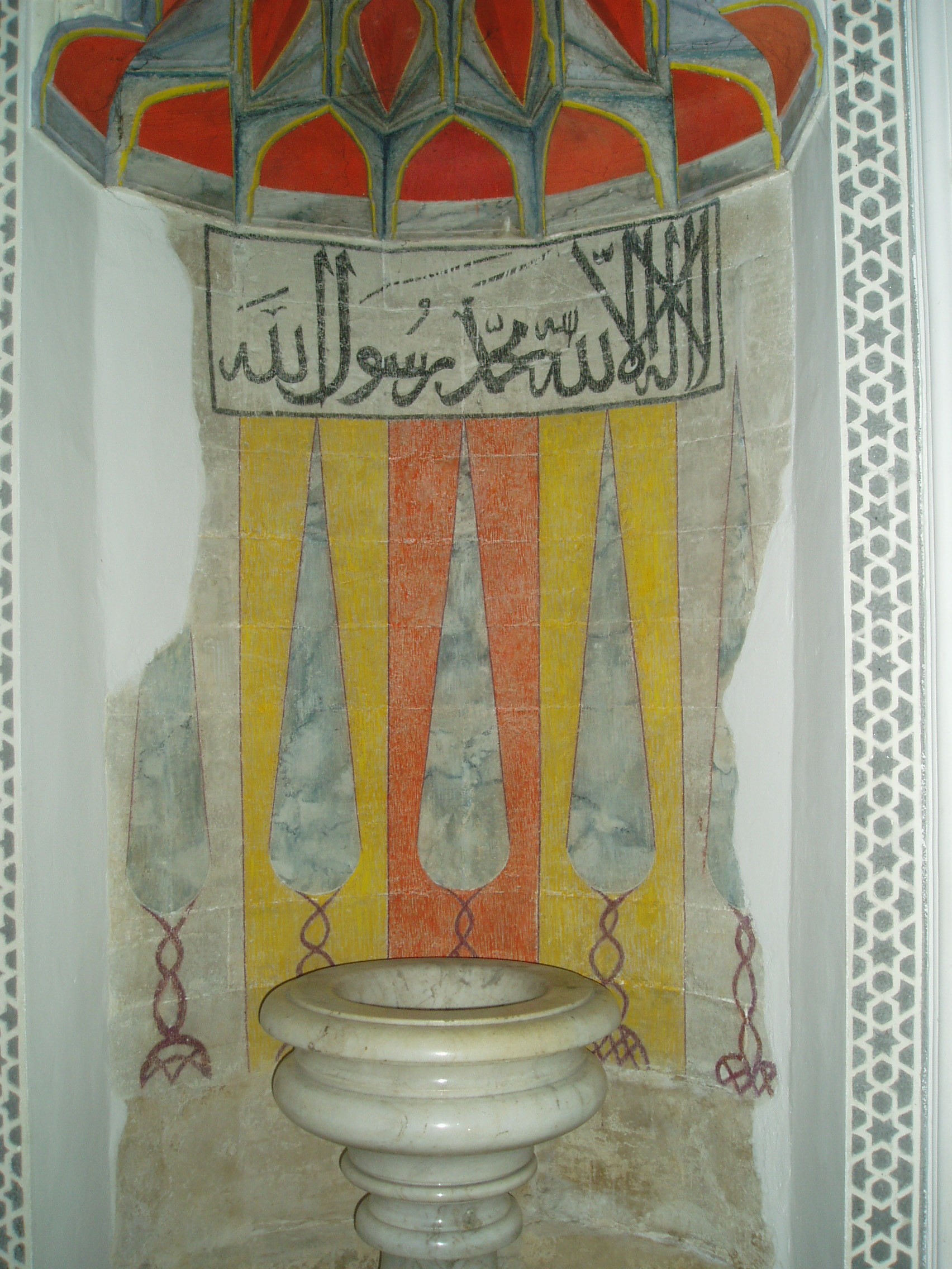 Nyilvános 1129 | 1731 | Pécs, Széchenyi tér: Dzsámi, ma Belvárosi templom | Az egykori Szent Bertalan-templom helyén épült fel a török dzsámi 1543-46 között. Építtetője Gázi Kászim, a később budai pasa volt. A török kiűzése után az épületet a jezsuiták kapták meg, a minaretet lebontották, az épületet átalakították, de az ma is őrzi az iszlám jegyeit. A dzsámi imafülkéje (mihrábja) a délkeleti fal tengelyében látható, festése rekonstrukció. Ettől balra és jobbra Allah és Mohamed nevének felirata figyelhető meg. Sztalaktit boltozata, szamárhátíves ablakai a mai keresztény templom hangulatában érdekesen idézik fel a török építészet sajátosságait. Szenteltvíztartói török mosdómedencék voltak. A fénykép 2006 júliusában készült. Felh. irod.: Csorba csaba: Pécs. Bp. Panoráma, 1983 www.vendegvaro.hu |