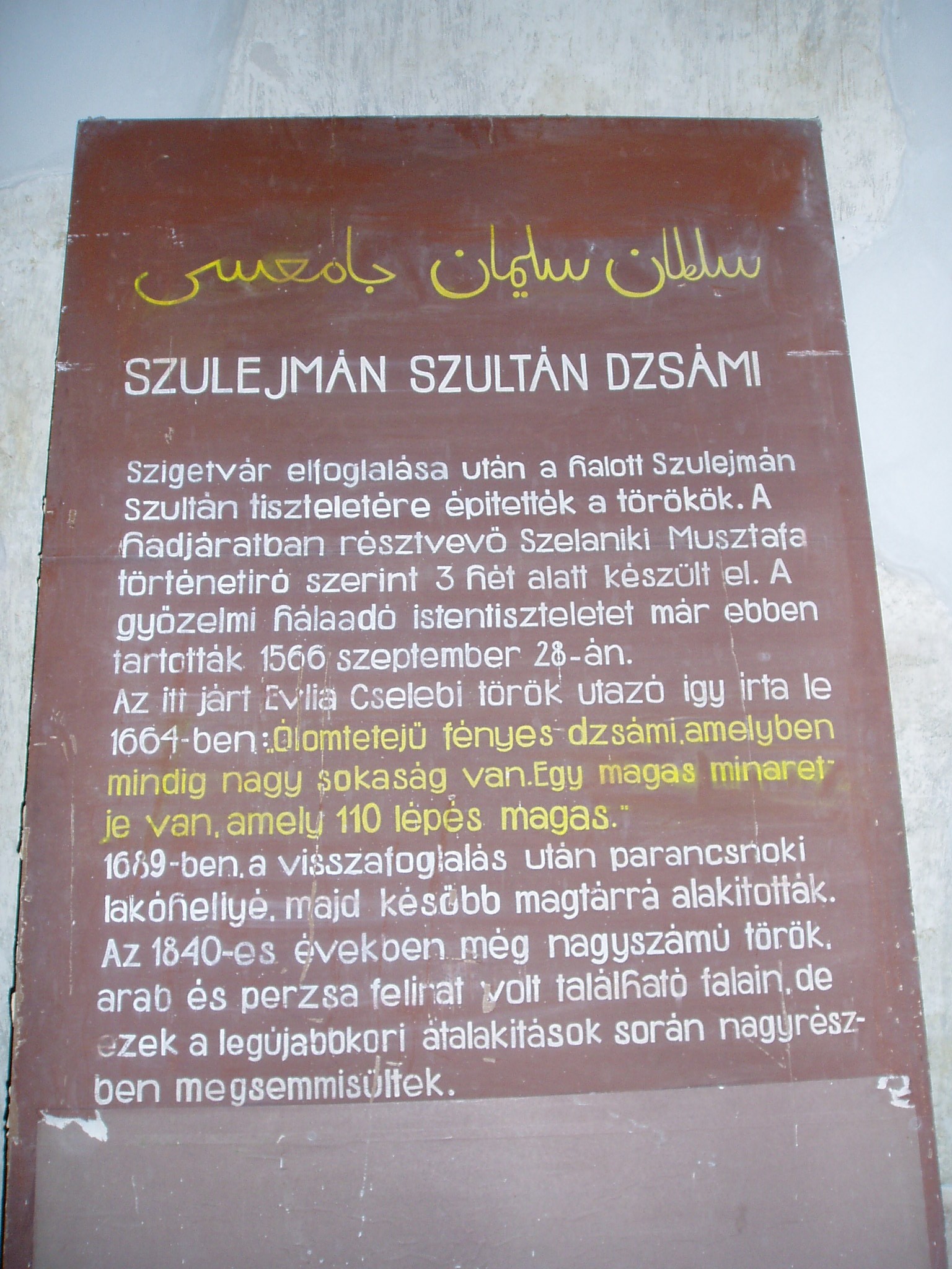 Nyilvános 1223 | 2002 | Szigetvár, Vár: dzsámi | A vár egyik központi épülete a Szulejmán dzsámi, amely a győztes szultán tiszteletére épült a XVI. században. A téglalap alaprajzú dzsámi Mekka felé néző oldalán látható a kőkeretes, egykor csempével borított, szalaktit boltozatú imafülke (mihrab). A dzsámit L alakú folyosó veszi körül, ennek délkeleti oldalán egy másik mihrab fülke található. Északnyugaton csatlakozik a dzsámihoz a szabályos tizennégyszög alakú minaret, amelynek nagy része a XVIII. században leomlott. A fénykép 2005 júniusában készült. Felh. irod.: Török műemlékek Magyarországon. = www.terebess.hu/keletkultinfo/minaret/szigetvar.html |