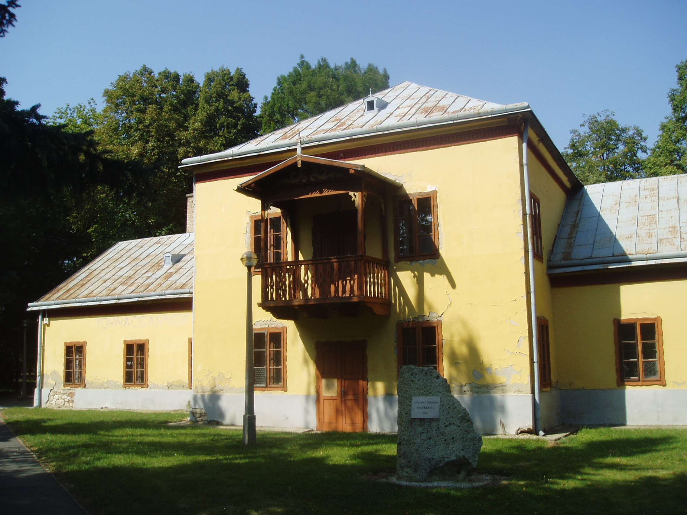 Nyilvános 1132 | 1676 | Sárospatak, Iskolakert: Tornacsarnok | A Református Kollégium (lásd: Sárospatak, Rákóczi u. 1.) bejáratával szemben találjuk az Iskolakertnek nevezett parkot. Az 1980-as években természetvédelmi területté nyilvánított Iskolakert sajátos nemzeti érték, mely egyedülálló az országban. Területén építették meg 1878-ban a kollégium tornacsarnokát, melyet az ország legrégibb tornatermének tartanak. Patak régóta fontos feladatnak tekintette a tanulók testi nevelését. Már 1838-ban játékteret alakítottak ki a diákoknak. S bár hazánkban a szertornázás kezdetét csak 1868-tól számítják, Patakon már 1854-ben használták a gimnasztikai szereket. A tornacsarnok, korabeli szóval "testgyakorda" építésével a kollégium megelőzte a Pesti Nemzeti Tornaegylet megalakulását. 1868-ban uszodát is építettek. A kollégium alsóbb osztályaiban a testgyakorlat már 1853-tól rendes tantárgy volt, amit az állam csak 1868-ban tett kötelezővé. Más szempontból is gondoltak az egészségvédelemre: 1791-től a kollégiumnak külön iskolaorvosa volt, s itt létesült 1863-ban az első magyar iskolai kórház is. A fénykép 2007 augusztusában készült. Felh. irod.: Ködöböcz József: Lakóhelyünk Sárospatak és körzete. Sárospatak, 2000 |