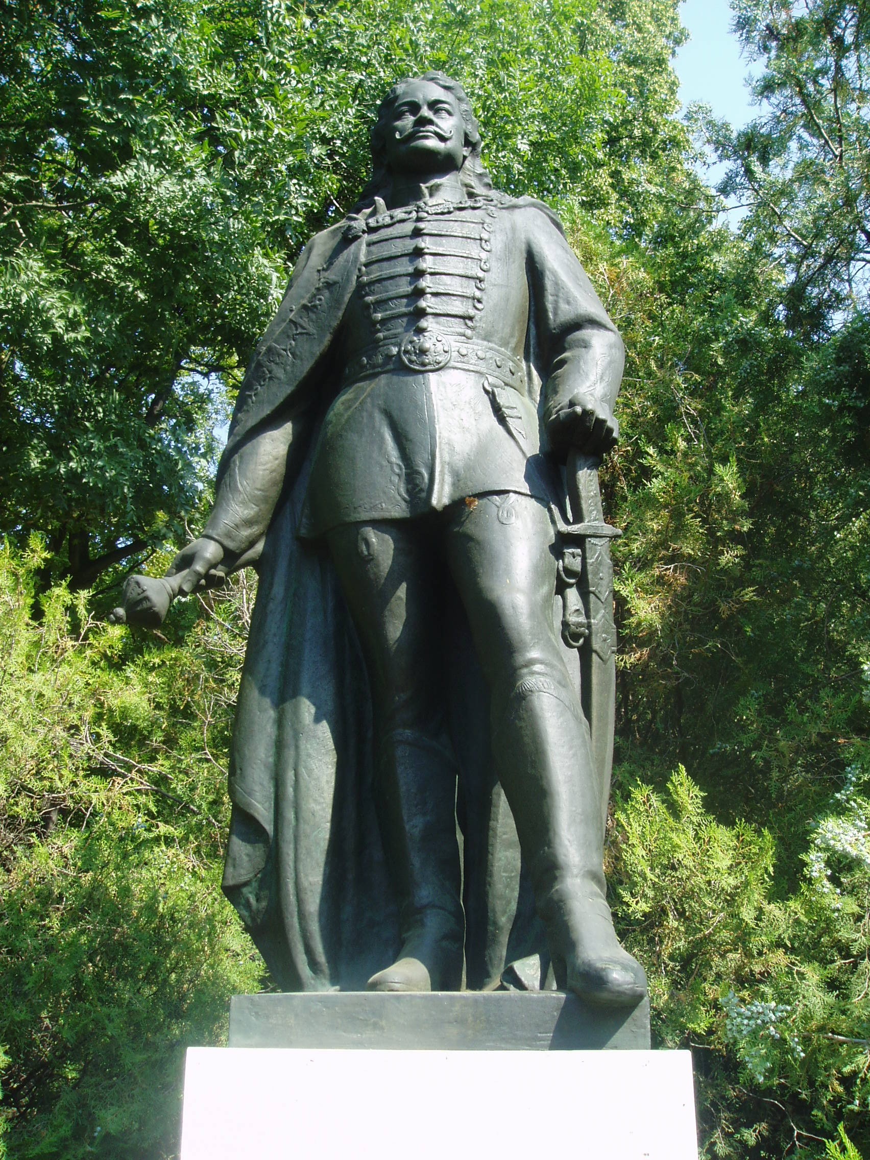 Nyilvános 1413 | 3399 | Sárospatak, Iskolakert bejárat: II. Rákóczi Ferenc | A Református Kollégium (lásd: Sárospatak, Rákóczi u. 1.) bejáratával szemben találjuk a hét hektáros Iskolakertet. Bejáratát két emlékmű fogja közre. II. Rákóczi Ferenc fejedelem egész alakos, bronz szobrát 1935-ben készítette Horváth Géza szobrászművész. A fénykép 2007 augusztusában készült. Felh. irod.: Látnivalók Borsod-Abaúj-Zemplén megyében. Miskolc, Well-PRess, 1995 |