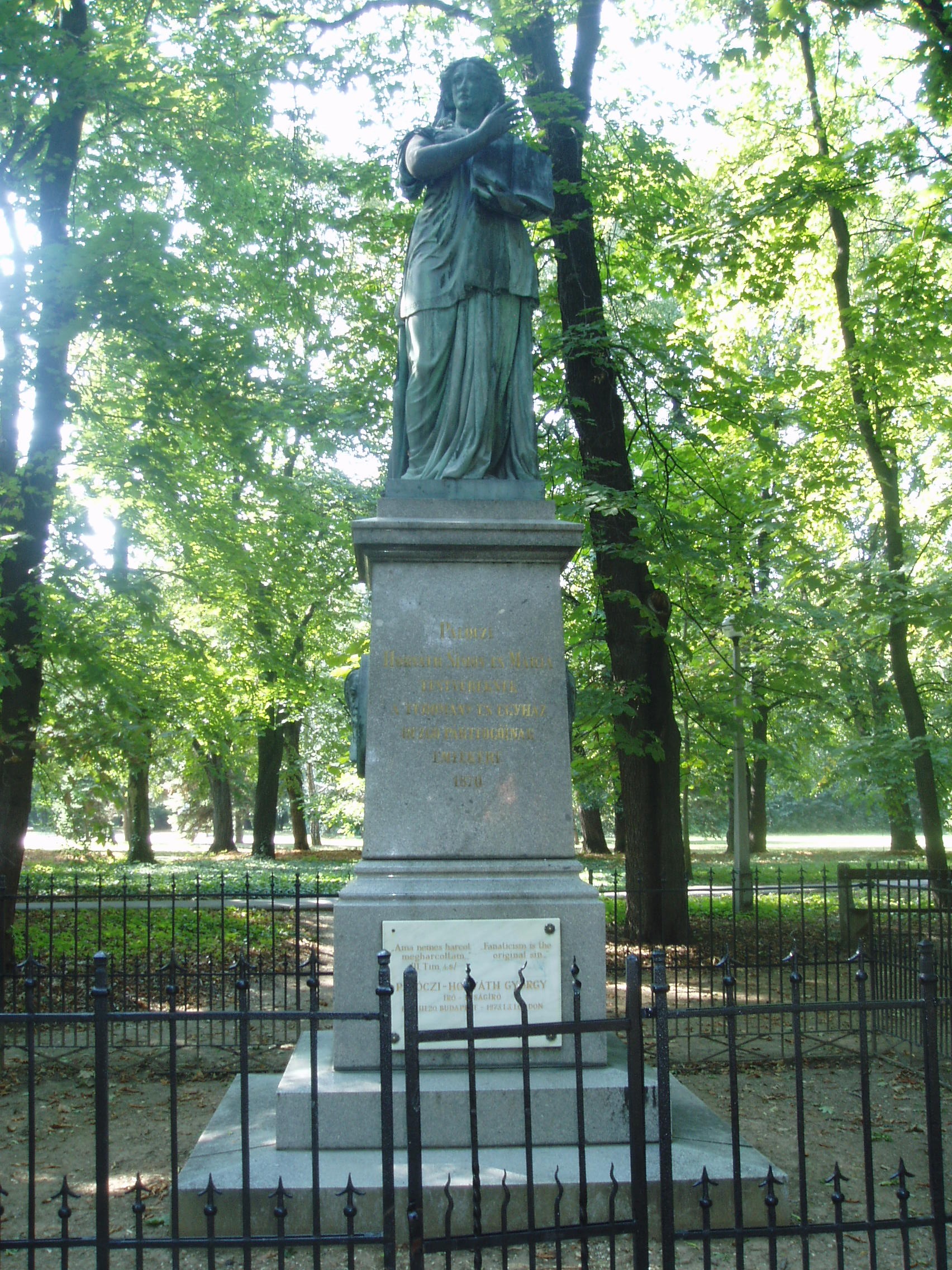 Nyilvános 1118 | 1694 | Sárospatak, Iskolakert: Pálóczi-Horváth-emlékmű | A Református Kollégium (lásd: Sárospatak, Rákóczi u. 1.) bejáratával szemben találjuk az Iskolakertnek nevezett parkot. Az 1980-as években természetvédelmi területté nyilvánított Iskolakert sajátos nemzeti érték, mely egyedülálló az országban. Sétányai mentén Patakhoz kötődő jeles személyiségek szobrai állnak. 1870 körül avatták fel az Iskolakertben a Pálóczi-Horváth-testvérek emlékművét. Készítője báró Vay Miklós főiskolai gondnok, szobrászművész. Az álló alakos nő a tudomány múzsája, bal kezében nyitott könyv, benne Bacon-idézet: ”A tudomány hatalom.” Pálóczi-Horváth Simon és testvére, Mária a XIX. század második felében jelentős összegekkel támogatta a református kollégiumot. Az emléművet portrédomborművük díszíti. A fénykép 2007 augusztusában készült. Felh. irod.: Látnivalók Borsod-Abaúj-Zemplén megyében. Miskolc, Well-PRess, 1995 www.sarospatak.hu/nevezetessegek |