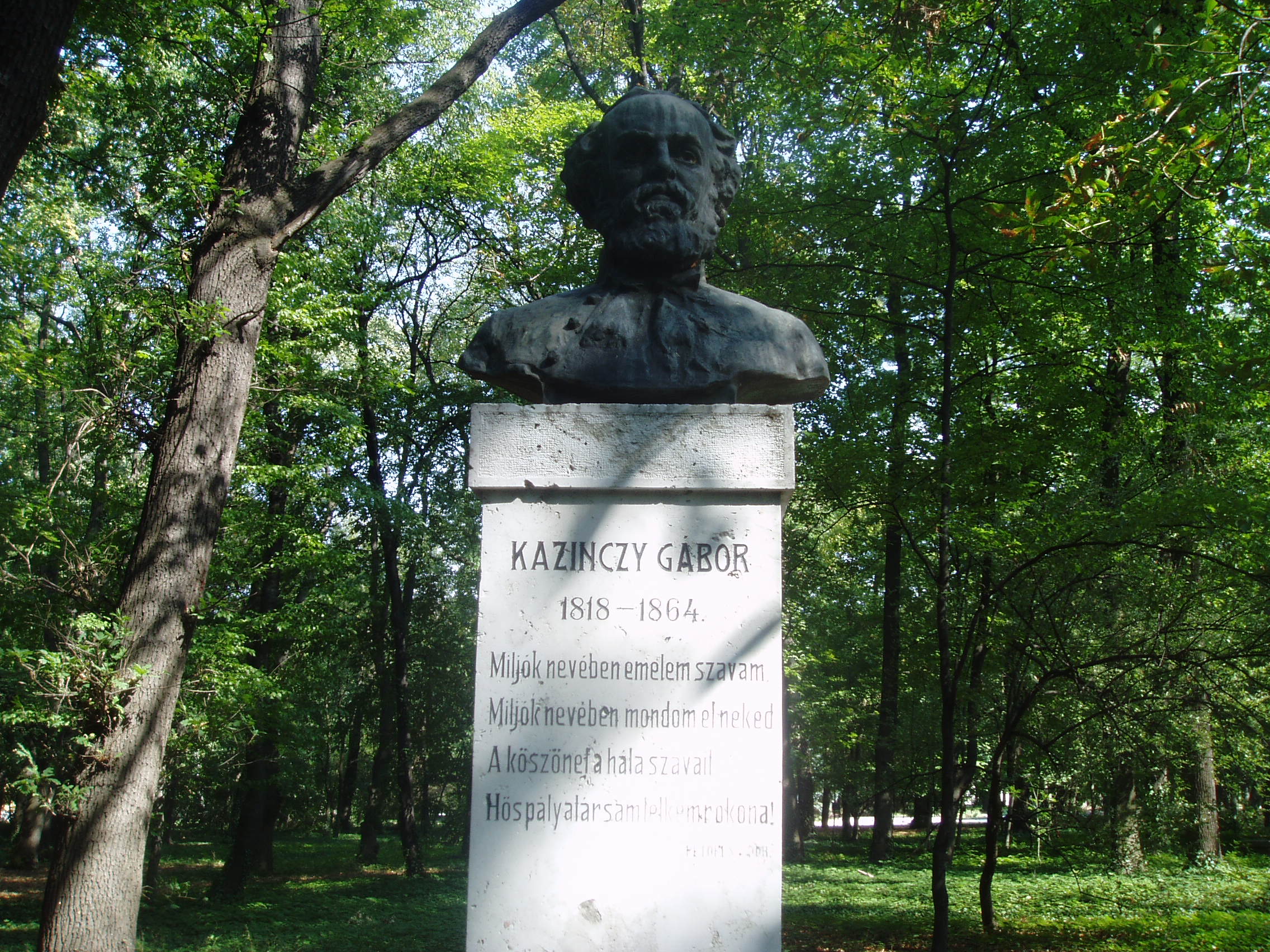Nyilvános 1135 | 1836 | Sárospatak, Iskolakert: Kazinczy Gábor szobra | A Református Kollégium (lásd: Sárospatak, Rákóczi u. 1.) bejáratával szemben találjuk az Iskolakertnek nevezett parkot. Az 1980-as években természetvédelmi területté nyilvánított Iskolakert sajátos nemzeti érték, mely egyedülálló az országban. Sétányai mentén Patakhoz kötődő jeles személyiségek szobrai állnak. Kazinczy Gábor (1818-1864) bronz mellszobrát, Maugsch Gyula alkotását 1937-ben avatták fel a Kossuth Kollégiumhoz vezető út jobb oldalán. Nagybátyja, Kazinczy Ferenc példáján felbuzdulva már tizenhárom éves korában elhatározta, hogy író lesz. Népbarát című lapja köré egész írókör tömörült. Későbbi életében már a politika játszotta a vezető szerepet: a reformellenzék egyik legnépszerűbb alakja volt. Szónoki tehetsége, melyet Petőfi is magasztalt, kortársai véleménye szerint Kossuthéval vetekedett. A szabadságharc bukása után hazája sorsa felett kétségbeesve a Borsod megyei Bánfalván húzódott meg, és csak 1861-ben lépett újra a nyilvánosság elé élete egyik legnagyobb hatású országgyűlési beszédével, majd reményeiben csalatkozva újra és most már véglegesen eltemetkezett magányába. A fénykép 2007 augusztusában készült. Felh. irod.: Látnivalók Borsod-Abaúj-Zemplén megyében. Miskolc, Well-PRess, 1995 www.sarospatak.hu/nevezetessegek A magyar irodalom története 3. kötet. Szerk. Sőtér István. Bp. Akadémiai Kiadó, 1965 |
