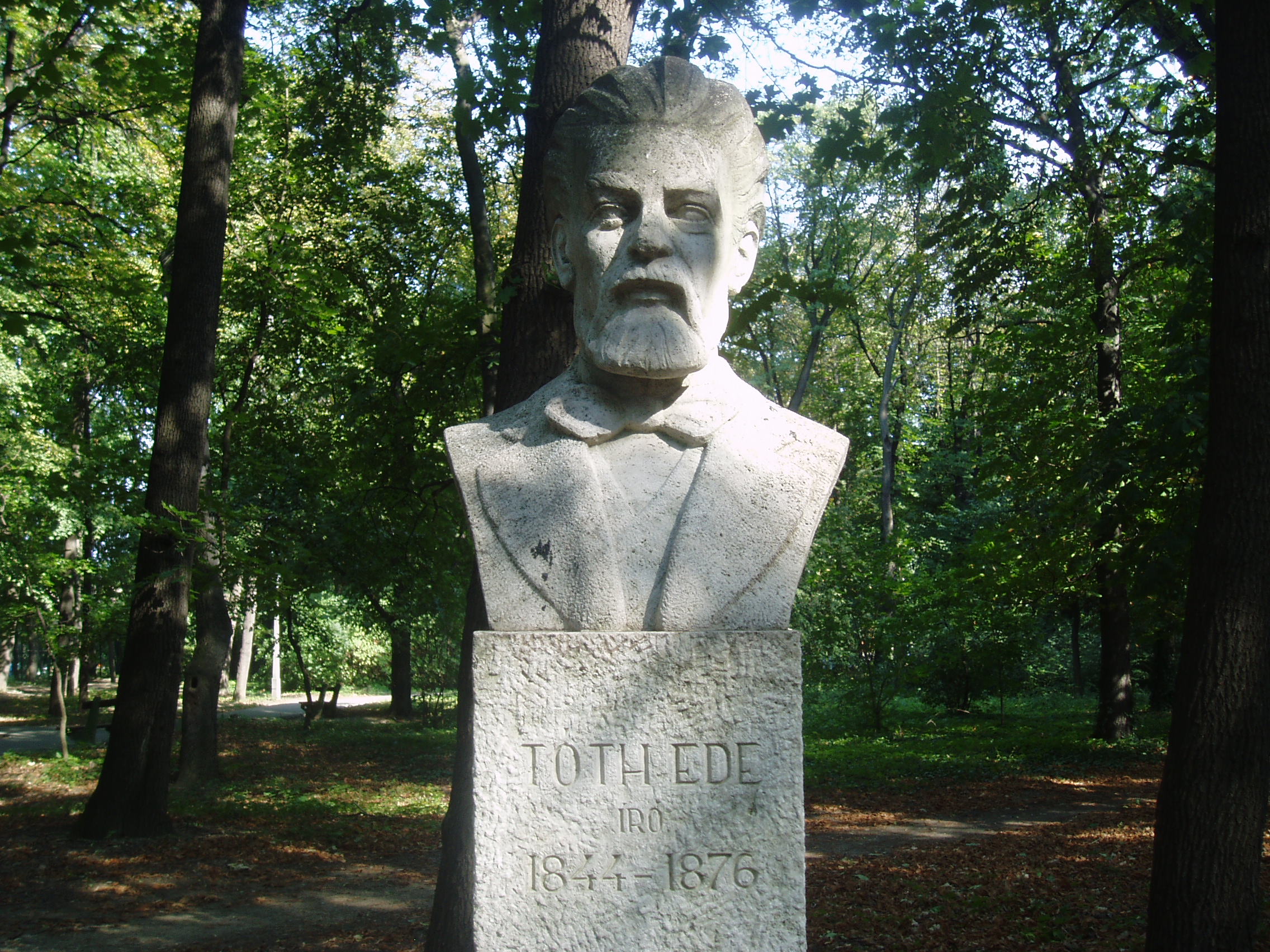 Nyilvános 1137 | 2144 | Sárospatak, Iskolakert: Tóth Ede szobra | A Református Kollégium (lásd: Sárospatak, Rákóczi u. 1.) bejáratával szemben találjuk az Iskolakertnek nevezett parkot. Az 1980-as években természetvédelmi területté nyilvánított Iskolakert sajátos nemzeti érték, mely egyedülálló az országban. Sétányai mentén Patakhoz kötődő jeles személyiségek szobrai állnak. Tóth Ede (1844-1876) író kőből faragott mellszobra Ugray György alkotása (1972). Az egykori pataki diák sok nyomorgás után, iskoláit abbahagyva 1864-ben vándorszínésznek állt. Éveken át rendületlenül próbálkozott az írással, de tehetségét addig nem fedezték fel, míg 1874-ben meg nem írta "A falu rossza" című színművét, mellyel elnyerte a 100 arany értékű Nemzeti Színház 100 arany értékű pályadíját, s egy csapásra híressé vált. A sok nélkülözés azonban annyira megrongálta egészségét, hogy tüdőbaján már nem lehetett segíteni. Rövid munkásságával is új lendületet tudott adni a népszínműnek. A fénykép 2007 augusztusában készült. Felh. irod.: Látnivalók Borsod-Abaúj-Zemplén megyében. Miskolc, Well-PRess, 1995 www.sarospatak.hu/nevezetessegek Magyar életrajzi lexikon |