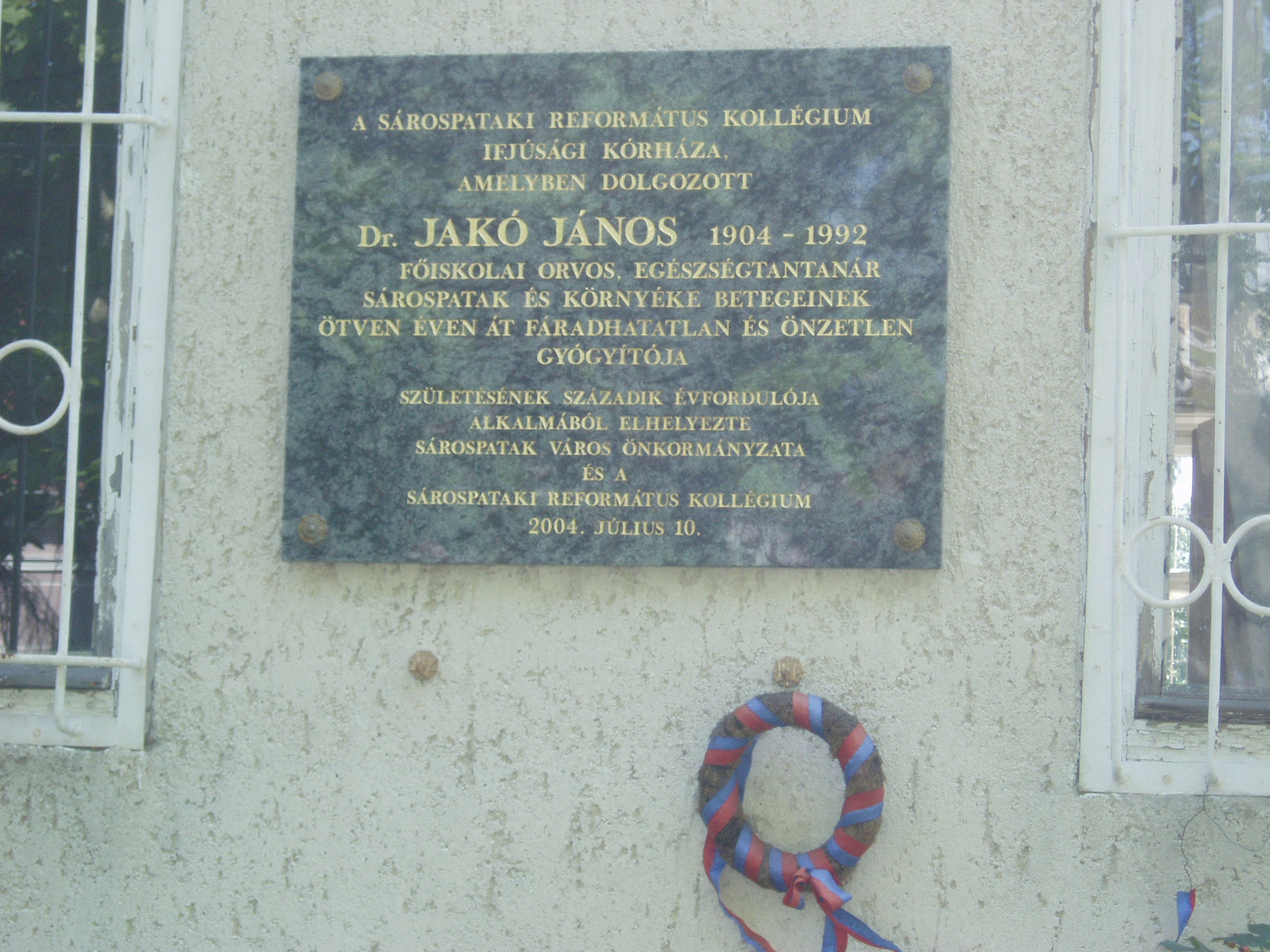 Nyilvános 1089 | 1790 | Sárospatak, Kazinczy utca 25. | A ma kollégiumként működő épületben egykor a Református Kollégium ifjúsági kórháza működött. Itt dolgozott Dr. Jakó János (1904-1992) iskolaorvos, egészségtanár. A kis kórházat 1937-ben az ő intenciói alapján élpítették fel. 1952 után körzeti orvosként gyógyította fáradhatatlanul és önzetlenül a környék betegeit. Emléktábláját 2004-ben, születése 100. évfordulója alkalmából állították. A fénykép 2007 augusztusában készült. Felh. irod.: Száz éve született dr. Jakó János. = Sárospataki Református Lapok 2004. 3. |