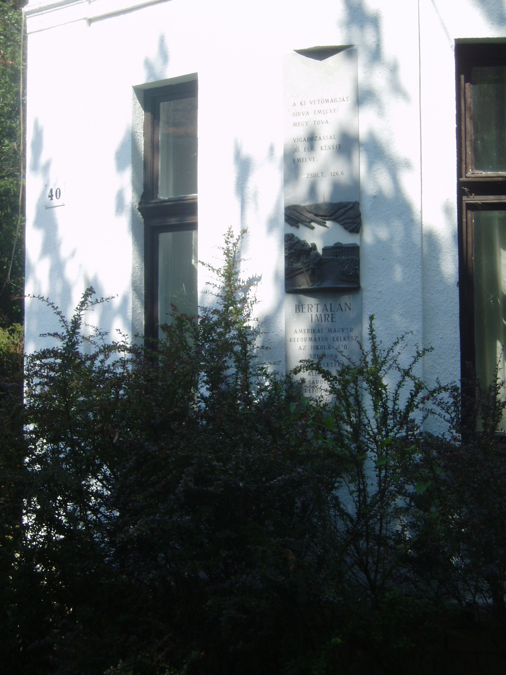 Nyilvános 1074 | 1773 | Sárospatak, Kazinczy utca 40. | Az Öregdiák vendégház, más néven Bertalan-ház homlokzatán Bertalan Imre amerikai-magyar lelkipásztor, a Református Kollégium (lásd: Sárospatak, Rákóczi u. 1.) 340. szeniora emléktáblája látható. Bertalan Imre az 1940-es évek elején volt pataki diák. A Kazinczy utcai lakóházat, ő adományozta volt iskolájának. Az épületet a kollégium alapítványa vette gondozásába, amely a mai és az öregdiákok különböző összejöveteleinek színhelyéül szolgál - a tudományos előadásoktól az öregdiák találkozókig. A fénykép 2007 augusztusában készült. Felh. irod.: Hű maradt Patakhoz. = www.patakidiak.hu/bertalan/ |