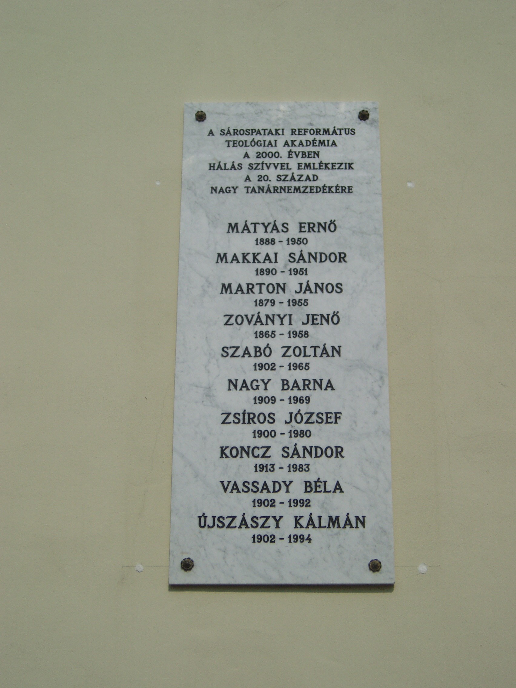 Nyilvános 1080 | 1563 | Sárospatak, Rákóczi utca 1. Református Kollégium | A Kollégium főépületének szárnyai által határolt tágas udvarban áll a régi iskolaépületek utolsó maradványa, az ún. Berna-sor. Északi falán 2000-ben helyezték el a pataki Református Jogakadémia nagy XX. századi tanárnemzedékének emléktábláját. A fénykép 2007 augusztusában készült. |