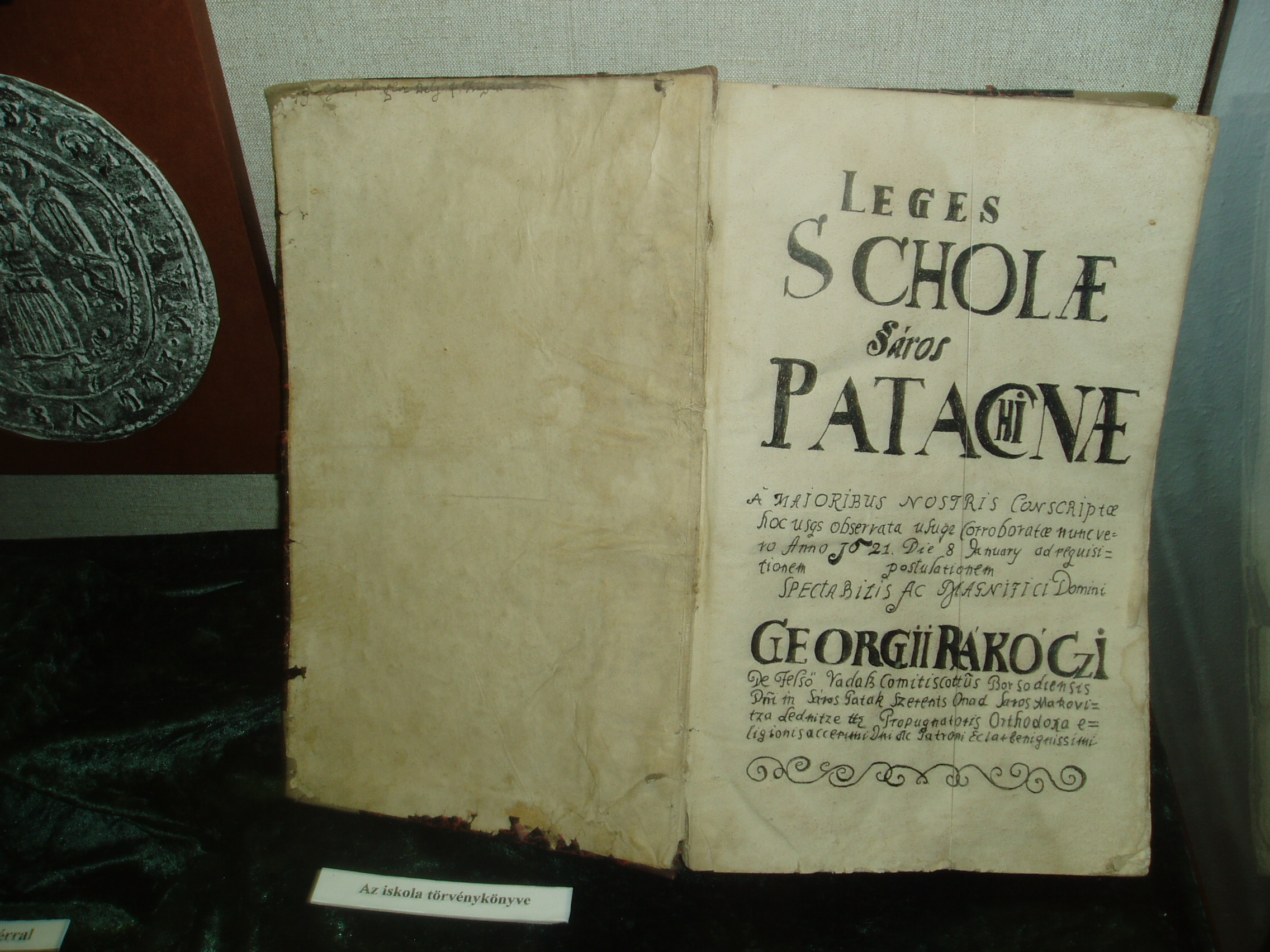 Nyilvános 1051 | 1512 | Sárospatak, Rákóczi utca 1. Református Kollégium | A Kollégium főépületének szárnyai által határolt tágas udvarban áll a régi iskolaépületek utolsó maradványa, az ún. Berna-sor. 1771/72-ben a fizika oktatása számára és a fizikaprofesszor lakásául épült. Az egyemeletes, hosszú szárny déli oldalát később kétszintes, árkádos tornáccal bővítették, feljáróval a nyugati oldalon. Az épület a korabeli provinciális magyar építészet szép példája. Az emelet boltozott termeiben a kollégium történetét bemutató kiállítás látható. A képen a Református Kollégium 1621-ből származó Törvénykönyve látható. A fénykép 2007 augusztusában készült. |