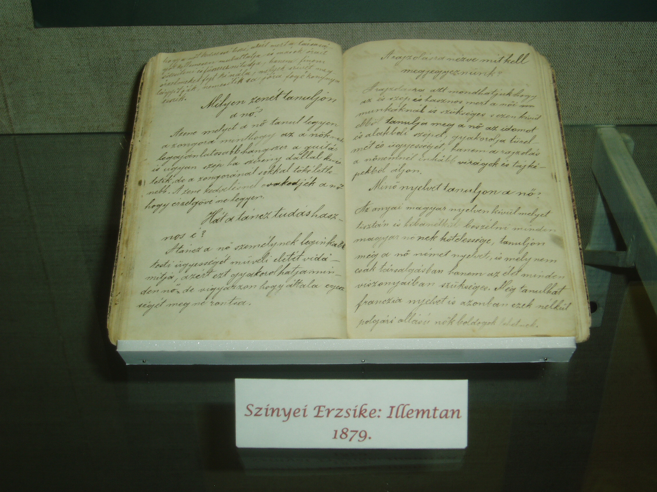 Nyilvános 1051 | 1565 | Sárospatak, Rákóczi utca 1. Református Kollégium | A Kollégium főépületének szárnyai által határolt tágas udvarban áll a régi iskolaépületek utolsó maradványa, az ún. Berna-sor. 1771/72-ben a fizika oktatása számára és a fizikaprofesszor lakásául épült. Az egyemeletes, hosszú szárny déli oldalát később kétszintes, árkádos tornáccal bővítették, feljáróval a nyugati oldalon. Az épület a korabeli provinciális magyar építészet szép példája. Az emelet boltozott termeiben a kollégium történetét bemutató kiállítást rendeztek be. A képen egy XIX. századi fiatal lány, Szinnyei Erzsike 1879-ben kézzel írt illemtankönyve látható. A fénykép 2007 augusztusában készült. Felh. irod.: Détsy Mihály: Sárospatak. Bp. Corvina, 1974 |