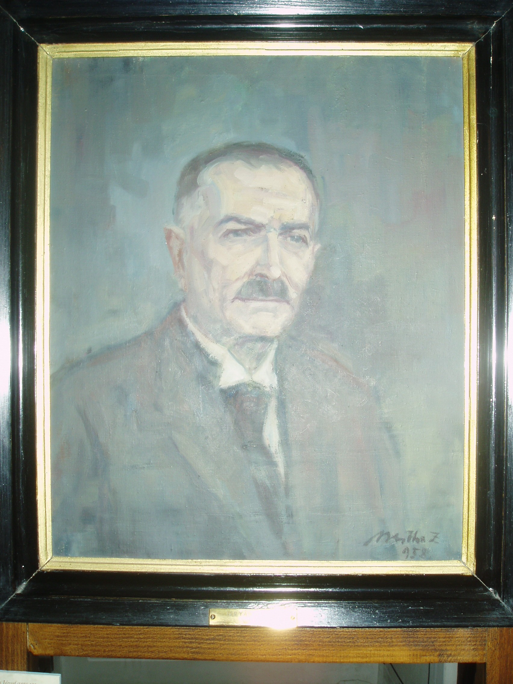 Nyilvános 1070 | 1579 | Sárospatak, Rákóczi utca 1. Református Kollégium könyvtára | A képen Gulyás József (1885-1954) főkönyvtárnok portréja, Bertha Zoltán olajfestménye látható. Gulyás József 1928 és 1944 között volt a könyvtár igazgatója. Több tanulmányt készített a főiskola és a könyvtár történetéről. A fénykép 2007 augusztusában készült. Felh. irod.: www.gradatio.hu/nagykonyvtar |