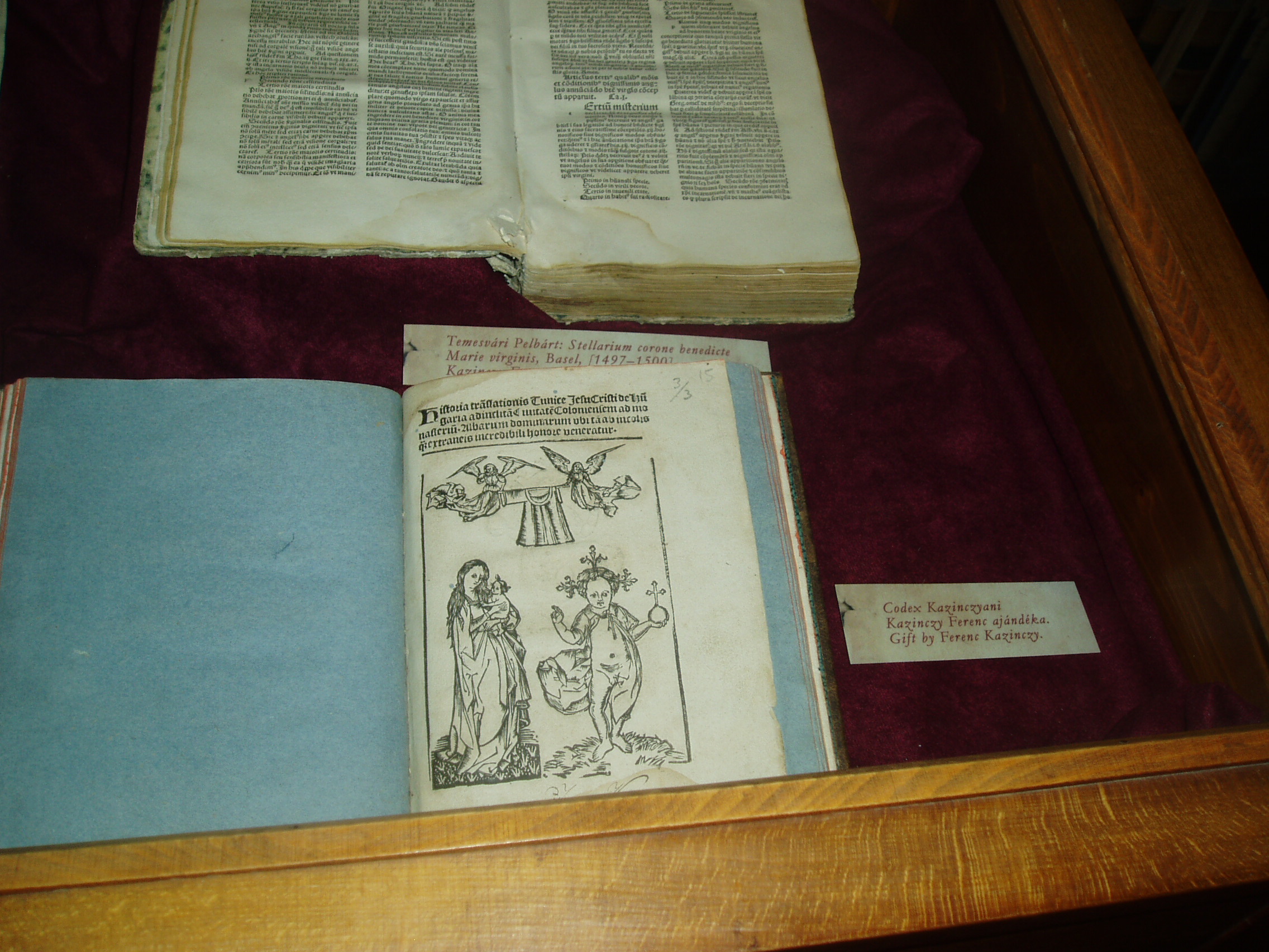 Nyilvános 1060 | 1645 | Sárospatak, Rákóczi utca 1. Református Kollégium könyvtára | Az 1531-ben alapított Sárospataki Református Kollégium könyvtára évszázadok óta az ország egyik legértékesebb könyvgyűjteménye. A második világháború előestéjén, 1938-ban állománya legbecsesebb részét Budapestre menekítették. Sajnos, nem lehetett előre látni, hogy a Sárospatakot elfoglaló szovjet csapatok megkímélték a kollégiumi könyvtárat, míg a Budapestre került kötetek a hadi események során eltűntek. Sorsukról sokáig semmit sem lehetett tudni, csak harminc év múlva derült ki, hogy a Nyizsnyij Novgorod-i Lenin Könyvtár egy részlegében őrzik őket. A rendszerváltás után tárgyalásokba lehetett bocsátkozni visszaadásukról, amelyre, sok vita után 2006. áprilisában kerülhetett sor. A hazatért 16–17. századi könyvek értéke nem pusztán azért felbecsülhetetlen, mert könyvritkaságokról van szó, hanem azért is, mert az elmúlt századokban ezeket a könyveket olvasták a kollégium diákjai, tanárai. A 96 latin, 33 magyar és 6 német nyelvű könyv több mint hatvan százaléka imádságoskönyv, a többi orvosi, jogi, történeti és útleíró mű. A visszaadott dokumentumok között van a képen lent látható két ritkaság: Temesvári Pelbárt Stelláriuma (fent) és az ún. Kazinczy-kódex. A "Stellarium coronae virginis Mariae" című, Szűz Máriát dicsőítő művet szerzője akkor vetette papírra, amikor az 1479-1481. évi pestisjárvány idején betegségéből felgyógyult. Bázelben nyomtatták ki 1496-ban. Bejegyzése szerint egykor Kazinczy Ferenc tulajdonát képezte, ugyanúgy, mint az ún. Kazinczy-kódex is, amely nevével ellentétben nem kézirat, hanem szintén ősnyomtatvány s három, magyar vonatkozású történeti munkát tartalmaz. (A könyvtárban idegenvezetés közben gyorsan kellett fényképezni, ezért a felvétel nem lett igazán jó; de fontossága miatt feltettem a képek közé - K.K.) A fénykép 2007 augusztusában készült. Felh. irod.: Détsy Mihály: Sárospatak. Bp. Corvina, 1974 www.gradatio.hu/nagykonyvtar Fehér Katalin: Hazatértek a sárospataki könyvek. = Könyv és nevelés 2006. 2. Kiss Endre József: Kazinczy Ferenc pataki könyvei. = http://patakcollection.extra.hu/doku/Kazinczy.htm |