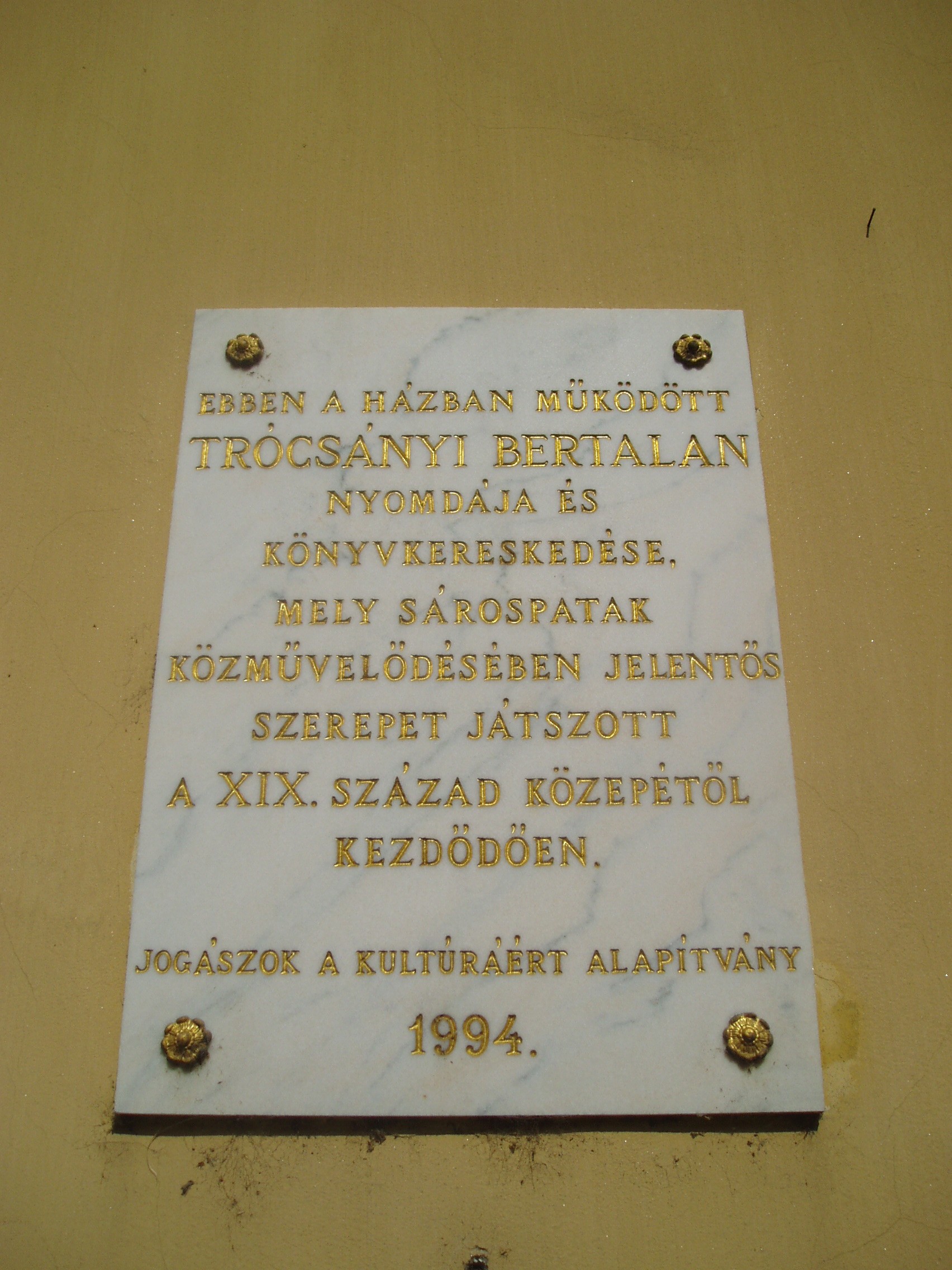 Nyilvános 1038 | 1425 | Sárospatak, Rákóczi utca 6. | A barokk stílusú épület hajdan a közeli Református Kollégium (lásd: Sárospatak, Rákóczi u. 1.) ún. kisinternátusa volt. A XX. század elején a benne lakó első éves joghallgatókról és teológusokról a diákok Gólyavárnak nevezték. Korábban ugyanebben a házban lakott Tompa Mihály, aki 1832 és 1844 között, és Gárdonyi Géza, aki az 1874/75-ös tanévben volt pataki diák. A XIX. század második felétől itt működött Trócsányi Bertalan nyomdája és könyvkereskedése, amely jelentős szerepet játszott Sárospatak közművelődésében. A fénykép 2007 augusztusában készült. Felh. irod.: Látnivalók Borsod-Abaúj-Zemplén megyében. Miskolc, Well-PRess, 1995 Erős Zoltán: Magyar irodalmi helynevek A-tól Z-ig. Bp. Kis-Lant Kiadó, 1995 |