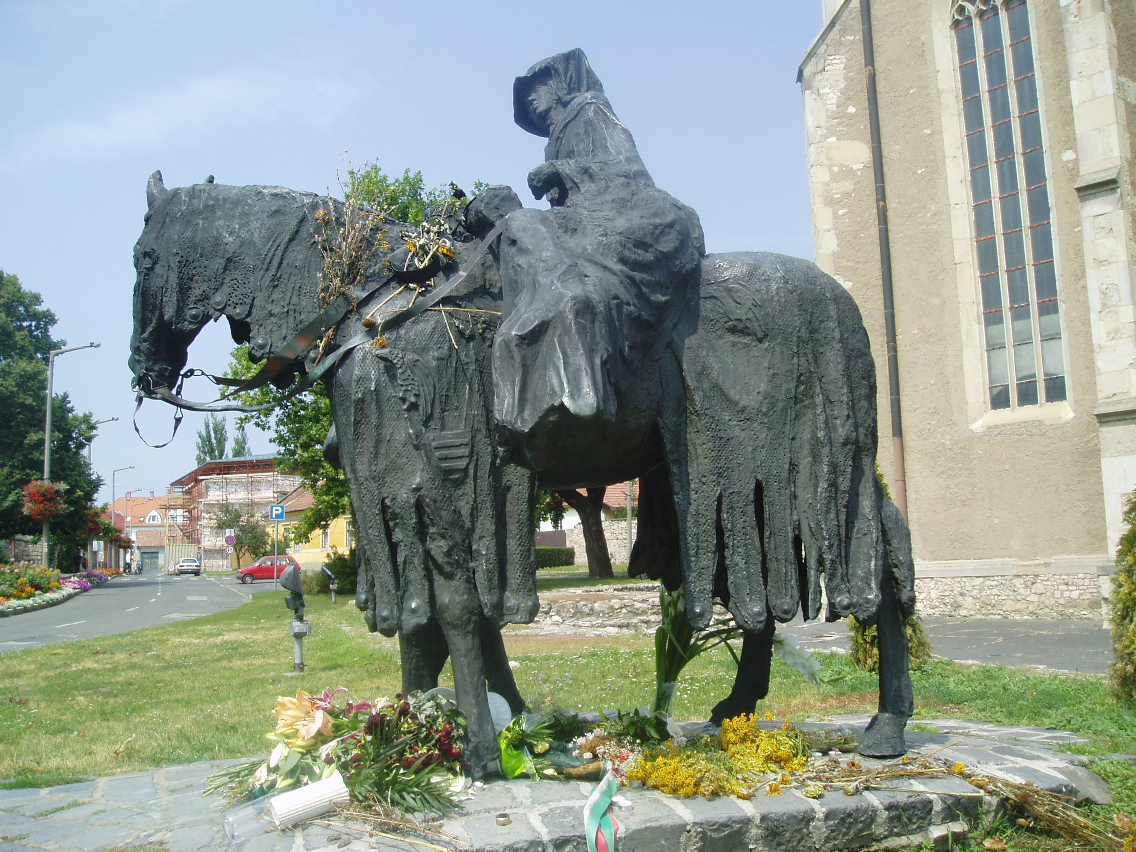 Nyilvános 1090 | 1732 | Sárospatak, Szent Erzsébet utca | A Vártemplom oldalbejáratánál áll Varga Imre 1985-ben felállított, Szent Erzsébetet és férjét, Thüringiai Lajos őrgrófot megörökítő lovas szoborcsoportja. A hagyomány szerint Erzsébet rövid élete során többször is hazalátogatott, s a Wartburg vára és Patak közti távolságot lóháton tette meg. Szent Erzsébet 1207-ben Sárospatakon született, Gertrudisz királyné és II. Endre király lányaként. Nagy valószínűséggel a Vártemplom román kori elődjében - amelynek maradványai a szobor közelében láthatók - keresztelték meg. A fénykép 2007 augusztusában készült. Felh. irod.: Látnivalók Borsod-Abaúj-Zemplén megyében. Miskolc, Well-PRess, 1995 |