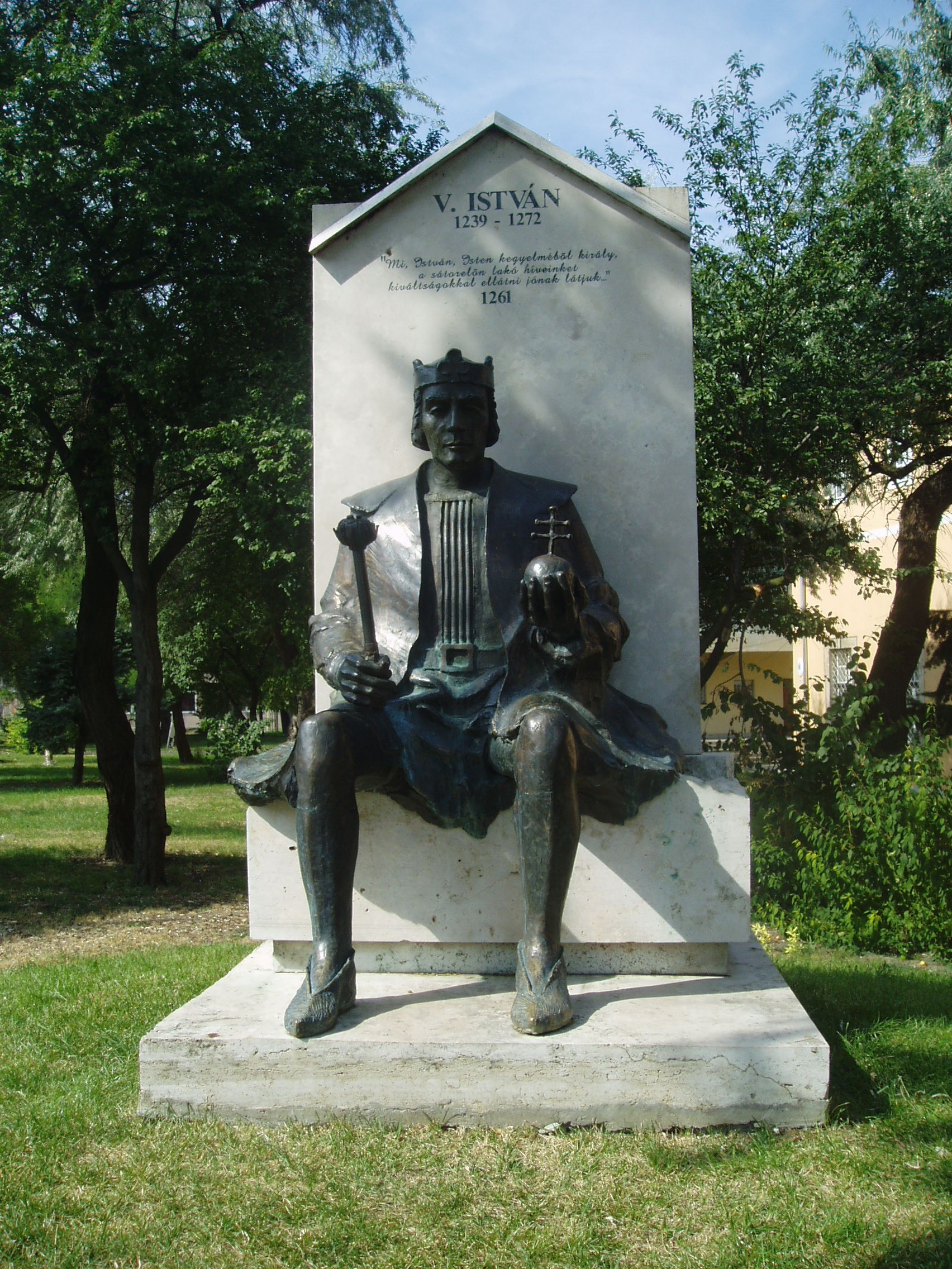 Nyilvános 1089 | 1550 | Sátoraljaújhely, Deák Ferenc utca 10-12. V. István szobra | A piarista templom előtt a közelmúltban állították fel V. István király szobrát. A település 1261-ben V. Istvántól kapott városi kiváltságokat. A kiváltságlevél kihirdetésének napját, szeptember 24-ét 2001-ben a város napjának nyilvánították. [Sajnos, a rendelkezésemre álló források közül nem tudtam kideríteni, hogy ki a szobrászművész, az interneten sem találtam semmit - K.K.) A fénykép 2007 augusztusában készült. Felh. irod.: Látnivalók Borsod-Abaúj-Zemplén megyében. Miskolc, Well-PRess, 2003 |