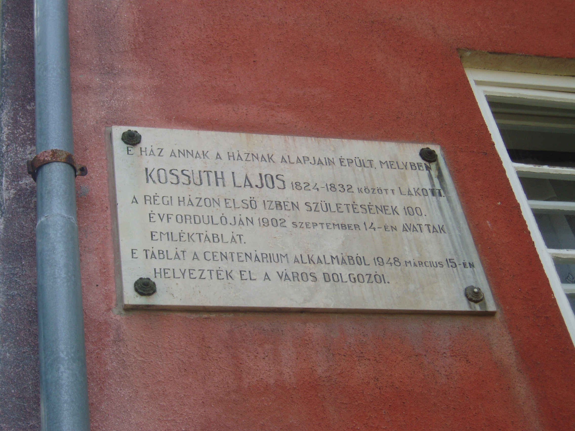 Nyilvános 1078 | 1866 | Sátoraljaújhely, Hősök tere 8. | Az emléktábla tanúsága szerint ez a ház annak a régi háznak alapjain épült, amelyben a Kossuth család 1824 és 1832 között lakott. Kossuth Lajos szülei - Kossuth László, az Andrássy grófok uradalmi ügyésze és Weber Karolin - házasságkötésüket követően Monokra költöztek szolgálati lakásba. Ott született meg 1802. szeptember 19-én Kossuth Lajos. A szülők a néhány hónapos csecsemővel Olaszliszkára költöztek (ott éltek Kossuth anyai nagyszülei). 1808-ban, a tehetséges kisfiú iskoláztatása miatt Sátoraljaújhelyen telepdtek le (lásd: Sátoraljaújhely, Móricz Zs. u. 17.), ahol Kossuth Lajos a piarista iskola (lásd: Sátoraljaújhely, Deák F. u. 10-12.) növendéke lett. Amikor a Kossuth család ebben a házban élt, a húszas éveiben járó Kossuth Lajos már jogot végzett fiatalember volt. 1821-24 között Pesten tevékenykedett, de 1824-ben hazatért Sátoraljaújhelyre, hogy egyetlen fiúként könnyíthessen idősödő apja terhein és segítsen a család egyre növekvő gondjain, amelybe időközben több lánytestvér is született. A család eredeti házát Kossuth Lajos születésének 100. évfordulóján, 1902-ben jelölték meg emléktáblával. Az utódépületen látható táblát 1848 centenáriumán állították. A fénykép 2007 augusztusában készült. Felh. irod.: Ács Tibor: Kossuth Lajos. Bp. MH OKAK, 1994 http://teroses.atw.hu/eletrajz.htm |