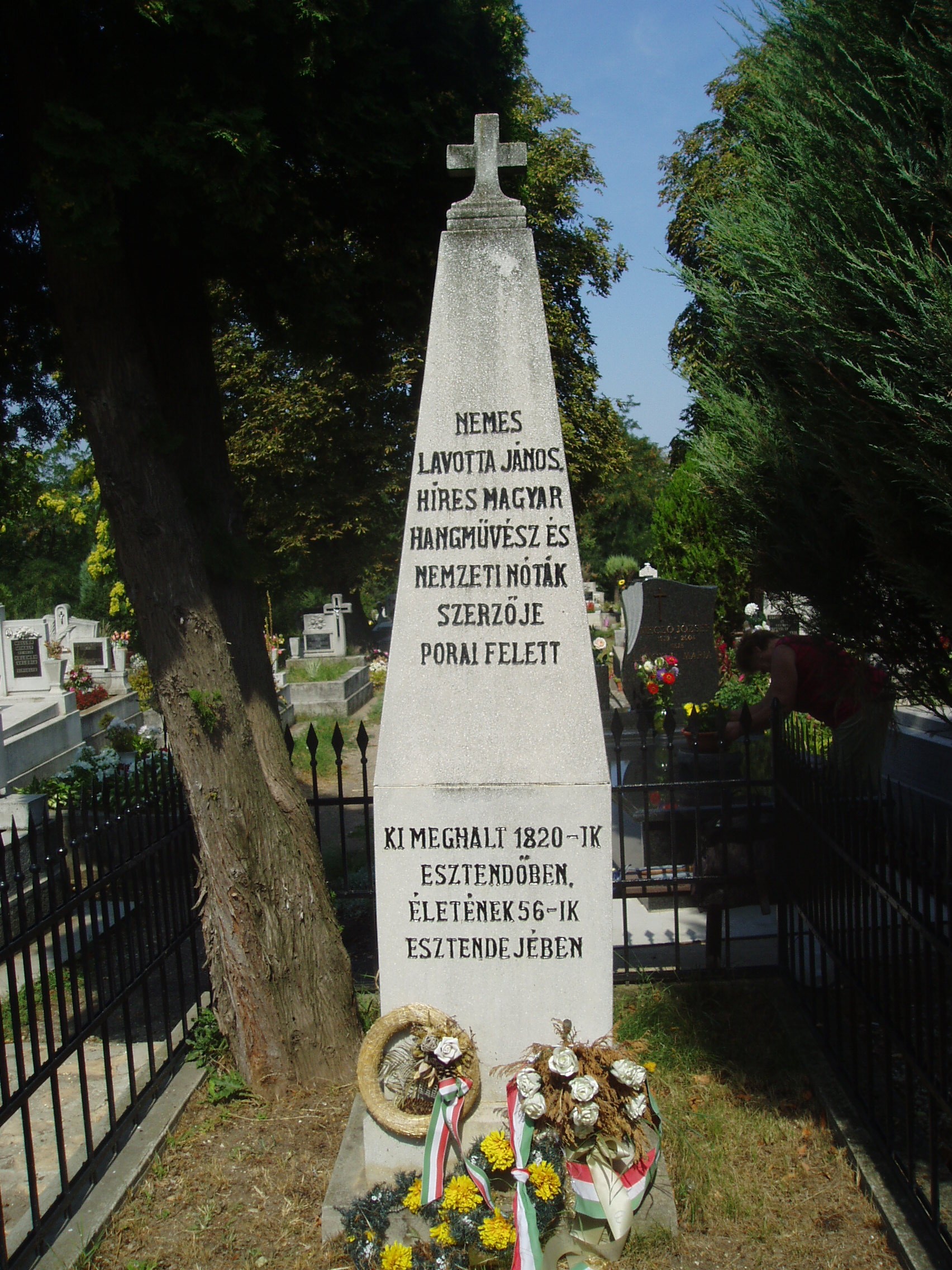 Nyilvános 1183 | 2200 | Tállya, Temető: Lavotta János sírja | Az 1820. augusztus 11-én - családtalanul - Tállyán elhunyt (lásd: Tállya, Rákóczi u. 24.) Lavotta Jánost nagy pompával, több vármegye urának részvételével helyezték örök nyugalomra a helyi temetőben. A hagyomány szerint hegedűjét is koporsójába tették. Temetésén zenekarával a verbunkos másik kiemelkedő képviselője, Bihari János játszott. Síremlékét, amely ma helyreállított állapotban látható, 1831-ben egy tisztelője, Újfalussy Mihály emelte. A verbunkos-triász egyik nagy mesterének tiszteletére a közelmúltban a Maillot-kastélyban emlékszobát rendeztek be (lásd: Tállya, Rákóczi u. 10.). Emlékét a település központjában felállított obeliszk (lásd: Tállya, Rákóczi u. 34.) is őrzi. A fénykép 2007 augusztusában készült. Felh. irod.: Szilágyi Sándor: Lavotta János. Bp. 1930. Dombóvári János: Pusztafedémestől Tállyáig. Miskolc, Szent Maximilian Kiadó, 1994 www.tallya.hu Takács Péter: Tállya. Bp. Száz Magyar Falu Könyvesháza Kht., 2001. /Száz magyar falu könyvesháza/ |