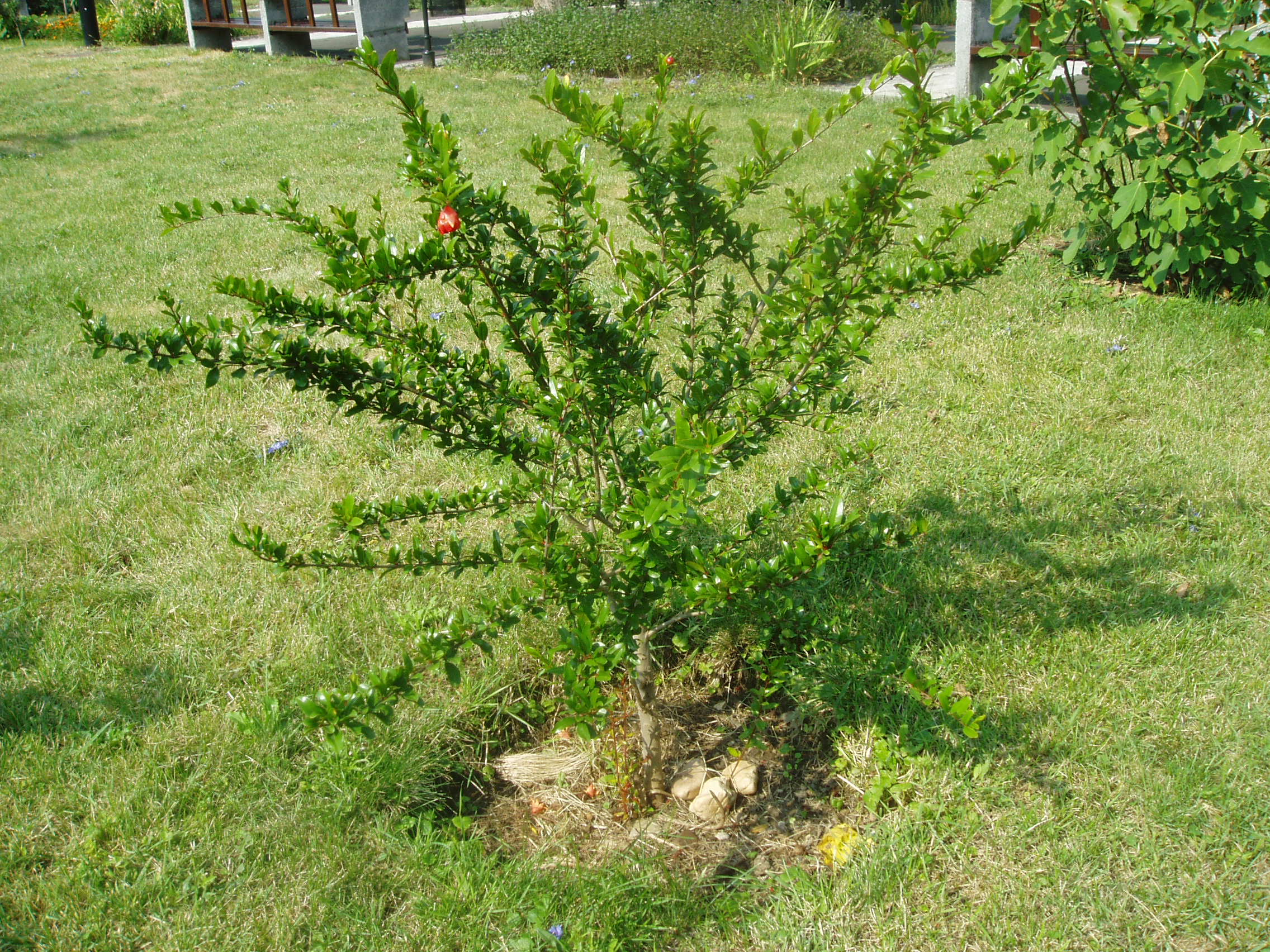 Nyilvános 1088 | 1597 | Sárospatak, Rákóczi utca 1. Református Kollégium | A Kollégium udvarán, a Berna-sor előtt alakították ki a Bibliai kertet. Mintegy ötven féle, a Bibliában említett növény található itt. Az eligazodást alaprajz és a növények jegyzéke segíti. A képen egy kis gránátalmafa látható. A fénykép 2007 augusztusában készült. |