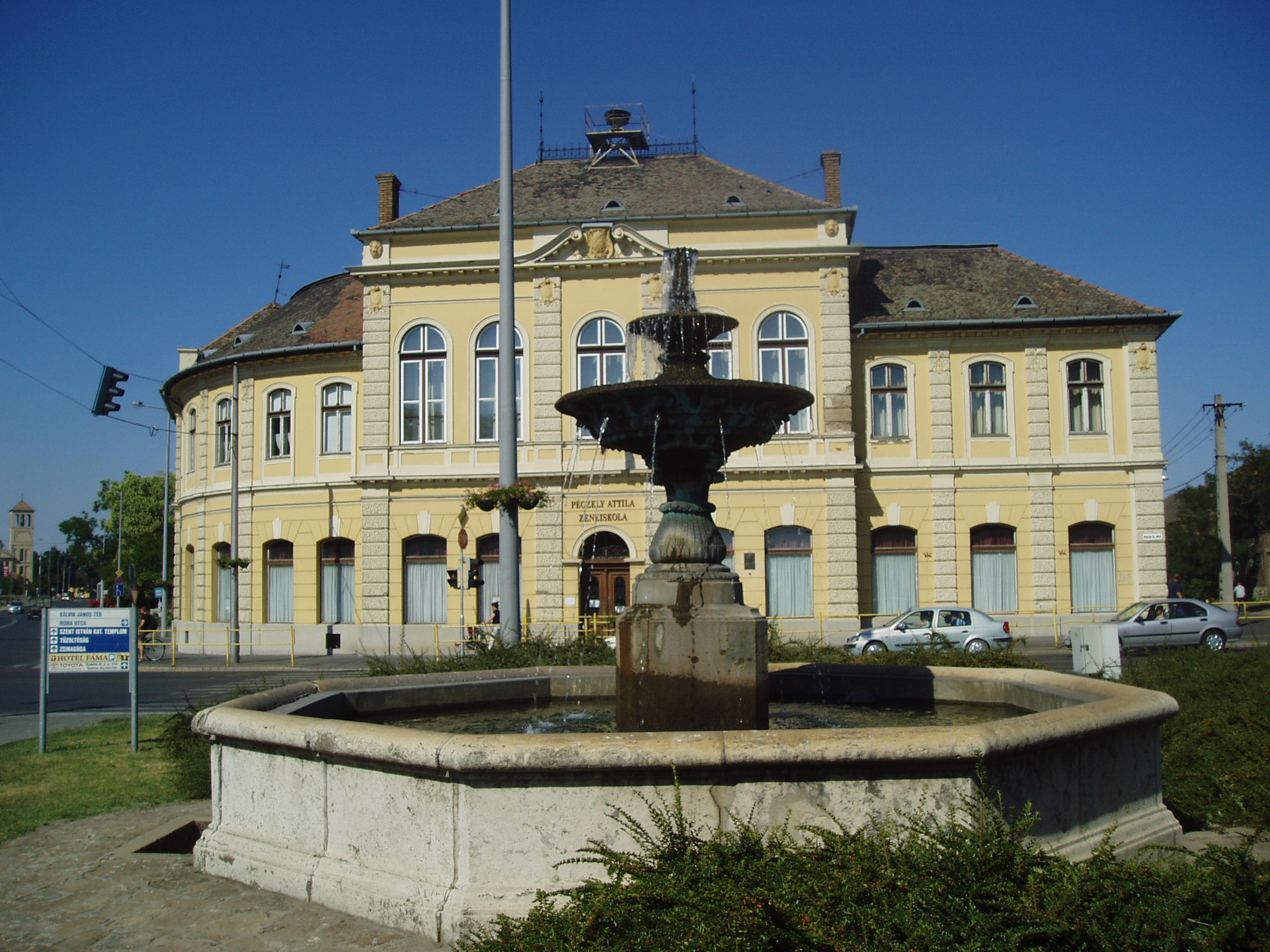 Nyilvános 1486 | 3191 | Hódmezővásárhely, Kálvin tér 4. | Az impozáns, eklektikus és reneszánsz jegyeket hordozó középület eredetileg a zsidó hitközség székháza volt. 1893-ban kezdték építeni Petrecz Pál tervei szerint. Benne a hitéleti helyiségek mellett 1894-ben nyílt meg a Központi szálloda, ám a helybeliek inkább "zsidó kávéháznak" nevezték a sok kulturális rendezvénynek otthont adó épületet. A zsidóság deportálása után leventeotthonként, majd MADISZ székházként funkcionált. 1957-ben költözött ide a városi zeneiskola, amely ma a kiváló, évtizedeken át Vásárhelyen élt orvos-népzenekutató-muzeológus Péczely László nevét viseli. Az épület előtt, a Kálvin tér közepén Nagy András János kútja áll. Az öntöttvas díszkút lefelé nagyobbodó tányérjaival a toszkán kutakat idézi. Ez az Alföld egyik legrégibb kútja, 1884-ben fúrta Zsigmondy Vilmos elgondolásai alapján Zsigmondy Béla. Mint a talapzatán elhelyezett táblán olvasható, a kút költségeit egy helybeli házaspár állta. A kút több, mint 250 méter mély, borovi fenyőből készített csövén hajdan 694 liter víz jött fel percenként. Miután fokozatosan elapadt, a városi vezetékre kapcsolták. A fénykép 2007 júliusában készült. Felh. irod.: Barangolások Csongrád megyében. Miskolc, Well-PRess, 1997 /Vendégváró/ Arató László - Batyi Zoltán: Hódmezővásárhely az alföldi művészváros. Hódmezővásárhely, 2004 |