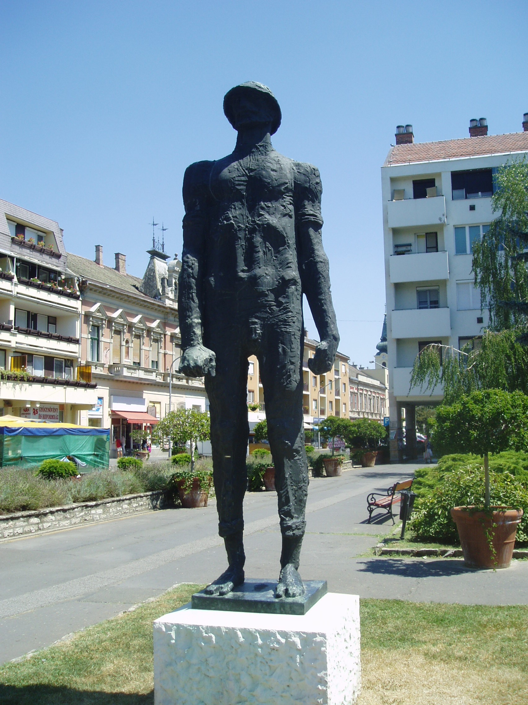 Nyilvános 1449 | 3802 | Hódmezővásárhely, Kossuth tér: Szántó Kovács János szobra | Szántó Kovács Jánost (1852-1908), a legendás parasztvezért Somogyi József mintázta meg. Szántó Kovács Jánost 1894-ben fogták el és tartották őrizetben a közeli városházán. Több komoly összetűzésre is sor került ezen a téren a kiszabadítására induló parasztok és a csendőrök között: 1894. április 22-én a téglagyáriak és az agrárproletárok megostromolták a városházát. Nagy Sándor főkapitányt megütlegelték, pipáját kezéből elragadták. Erről szól Thury Zoltán: A pipa című novellája. A következő évben Szántó Kovácsot ötévi börtönre ítélték, de hősként vonult be a város történetébe. 1908-ban hunyt el, díszsírhelye a Kincses temetőben található. Somogyi József Szántó Kovács Jánosának szikár alakja, ökölbe szorított keze erőről, elfojtott indulatról vall. A szobor mintázásmódja darabos, rücskös; felületén látszanak a mintázófa nyomai, éles barázdák szántanak át rajta, nyugtalan, drámai hatást keltve. A szoborból áradó feszültség jól érzékelteti a mű társadalmi mondanivalóját. Lenyűgözően szuggesztív hatása ellenére 1965-ben történő felállításakor nagy vitát váltott ki; sokan nem értették meg mondanivalóját, szokatlannak találták formanyelvét, mára azonban alkotójának egyik legismertebb műve lett. A fénykép 2007 júliusában készült. Felh. irod.: Barangolások Csongrád megyében. Miskolc, Well-PRess, 1997 /Vendégváró/ Arató László - Batyi Zoltán: Hódmezővásárhely az alföldi művészváros. Hódmezővásárhely, 2004 |