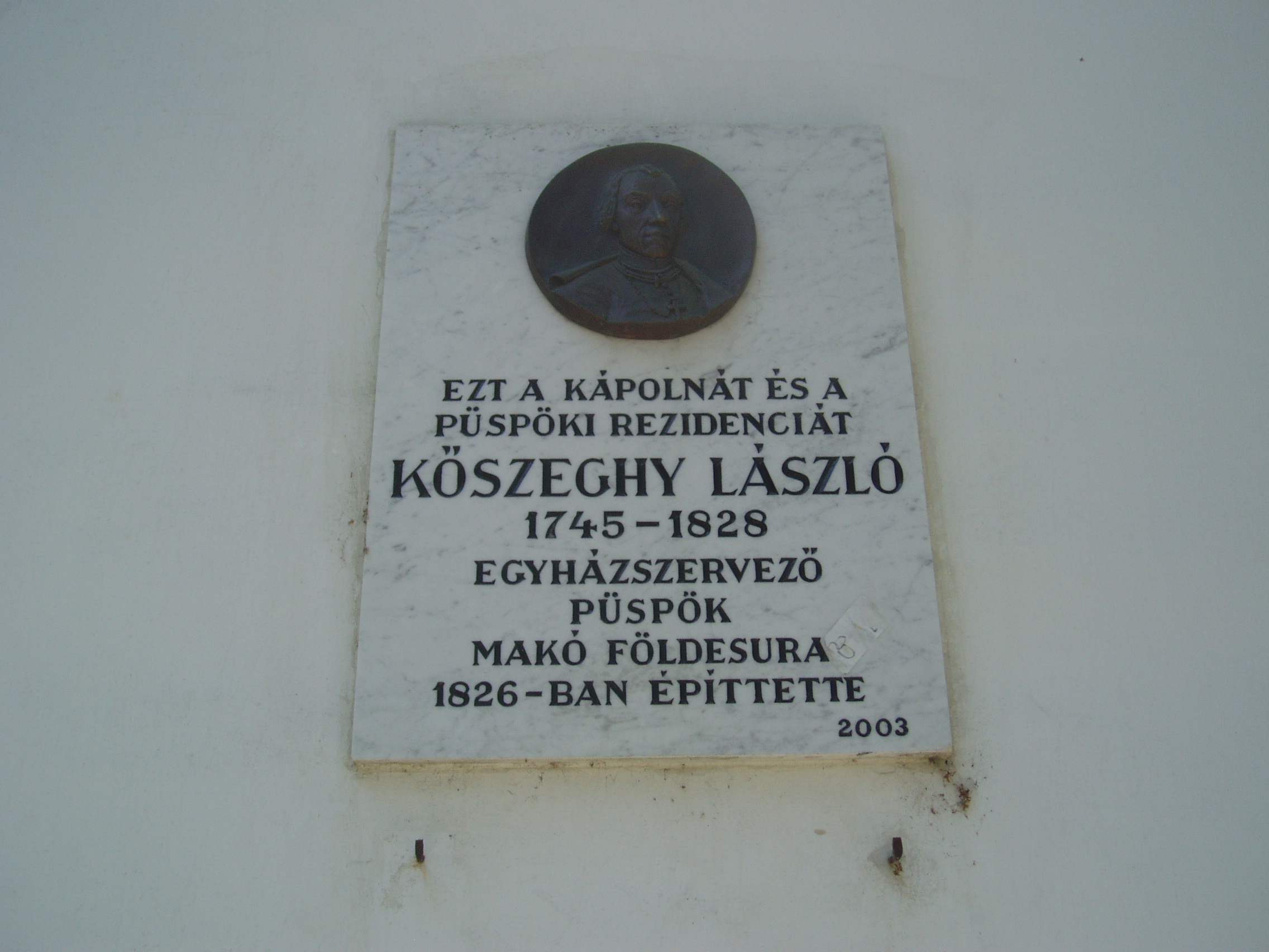 Nyilvános 1057 | 1530 | Makó, Csanád vezér tér 12. | A volt püspöki nyaralókastélyt a Temesvárott lakó Kőszeghy László (1745-1828) csanádi püspök emeltette 1826-ban a hozzá csatlakozó dór oszlopos kápolnával együtt. A külső homlokzaton jeles, az épülethez kötődő csanádi püspökök, illetve püspöki helynök emléktábláit helyezték el. A képen az építtető püspök emléktáblája látható. A fénykép 2007 júliusában készült. Felh. irod.: Barangolások Csongrád megyében. Miskolc, Well-PRess, 1997 |