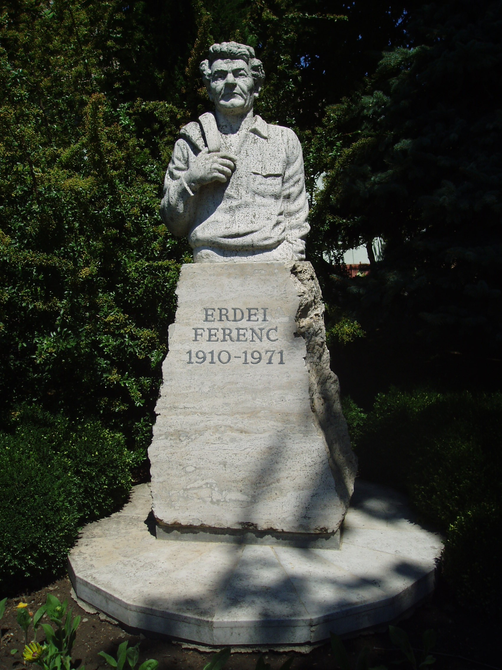 Nyilvános 1168 | 1764 | Makó, Erdei Ferenc tér: Erdei Ferenc szobra | A Megyeház utcán végigmenve jutunk az Erdei Ferenc térre. A tér 9. számú házának helyén állt valaha Erdei Ferenc (1910-1971) agrárközgazdász, politikus, szociográfus, tudományszervező szülőháza, amelyet a József Attila Múzeum udvarán (lásd: Makó, Megyeház u. 4.) udvarán rekonstruáltak. A róla elnevezett téren állították fel Makó nagy szülöttének szobrát, aki végakaratának megfelelően a közeli református temetőben nyugszik. A fénykép 2007 júliusában készült. Felh. irod.: Barangolások Csongrád megyében. Miskolc, Well-PRess, 1997 |