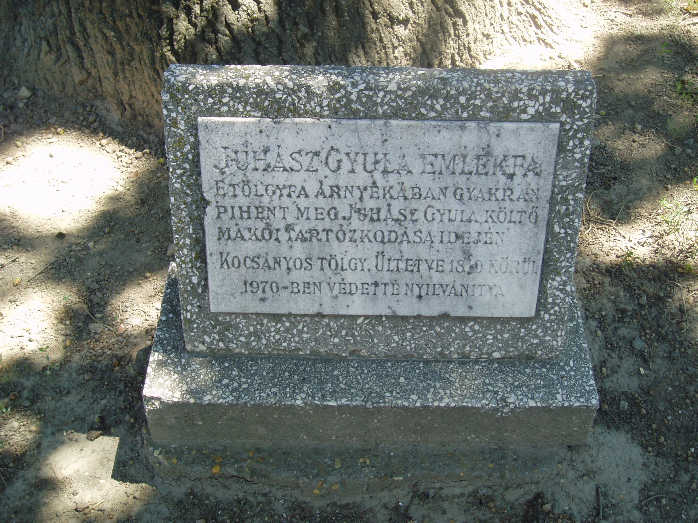 Nyilvános 1078 | 1557 | Makó, Megyeház utca 16. Juhász Gyula-emlékfa | A Megyeház utca 16. számú ház előtti kis parkban áll a Juhász Gyula-emlékfa. A másfél méter törzsátmérőjű kocsányos tölgyet az 1810-es években ültették. Juhász Gyula gyakran kereste fel makói tartózkodása idején. A fénykép 2007 júliusában készült. Felh. irod.: Barangolások Csongrád megyében. Miskolc, Well-PRess, 1997 |