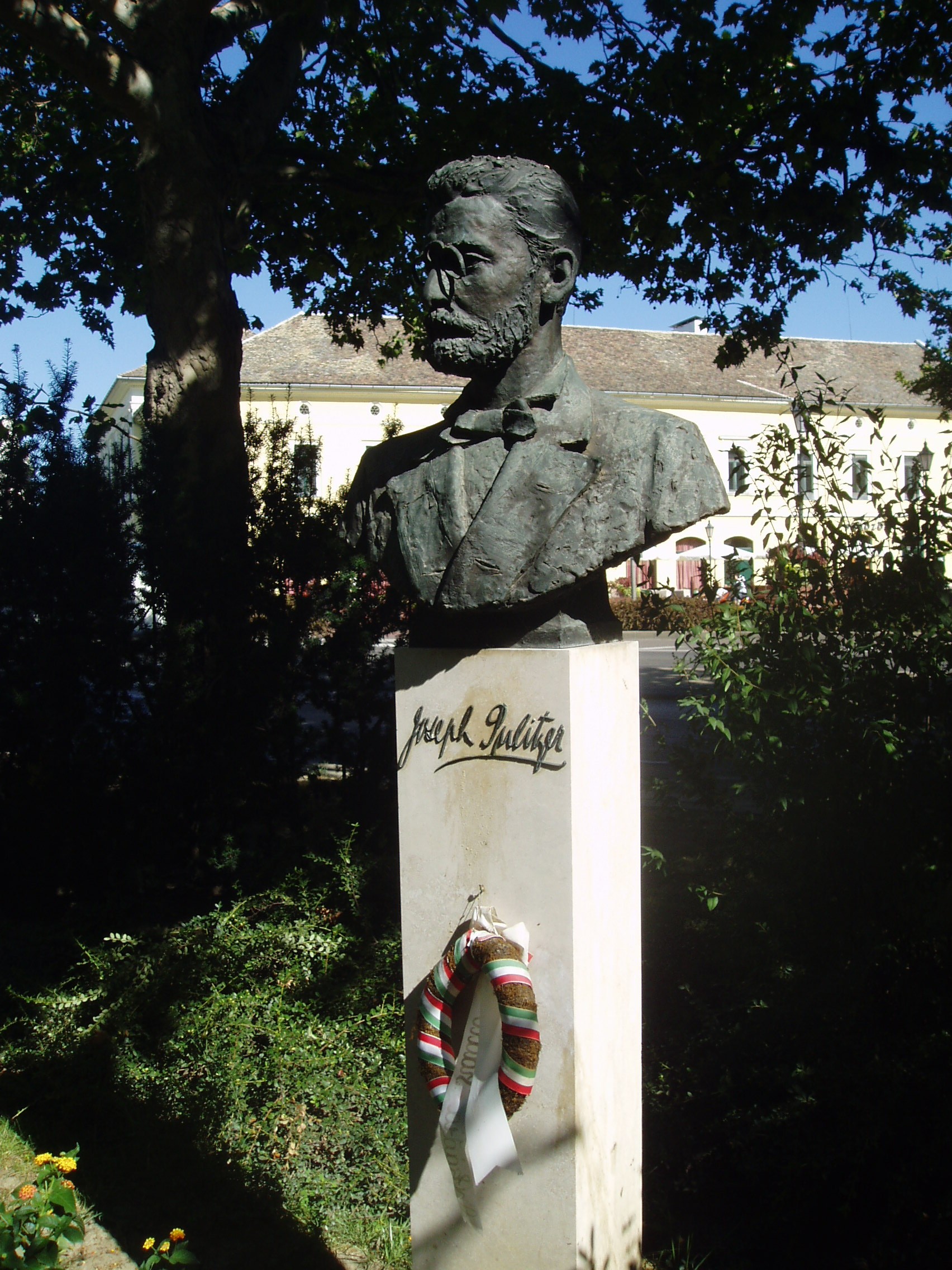 Nyilvános 1075 | 1514 | Makó, Széchenyi tér 13-15. | A Széchenyi teret déli oldalról az 1970-ben épült ún. csipkeházsor határolja, földszintjén üzletekkel. A házsor előtti kis parksávban a makói születésű Pulitzer József (1847-1911) mellszobra áll (Kiss Jenő alkotása). Az egyetemes sajtótörténet kiemelkedő alakja a makói városháza közelében, az Úri utca 4. számú, azóta emléktáblával megjelölt házban született (sajnos, amikor Makón jártam, ezt az információt még nem tudtam, ezért nincs róla kép - K.K.). Elszegényedett kereskedőcsaládból származott, iskoláit Budapesten végezte. A katonai pálya iránt vonzódott, de gyenge egészsége, rossz szeme miatt sorra elutasította az osztrák hadsereg, a francia idegenlégió és az angol gyarmati hadsereg. Tizenhat évesen hajófűtőként vándorolt ki Amerikába, ahol még éppen részt vehetett a polgárháború utolsó szakaszában. A Vadnyugaton számos mesterséget megpróbált, volt sikertelen öszvérápoló, bálnavadász és temetőgondnok, végül bánatában újságírónak állt. Egy St. Louis-i német laphoz szegődött el, ahol hamar kedveltté váltak színes, érdekes írásai. Fokozatosan egyre nagyobb részesedést vásárolt az újságban, végül tulajdonos lett, majd felvásárolta és egyesítette a város lapjait. Miután 1869-ben megkapta az amerikai állampolgárságot, New Yorkba költözött, ahol - a Hearst-lapokkal rivalizálva - megalapította saját média-birodalmát. Romló látása és gyengülő egészsége miatt 1887-től fokozatosan visszavonult a napi munkától, de az irányítást megtartotta. Jachtján hunyt el 1911-ben. Benne tisztelik a modern hírlapírás atyját, aki azt vallotta: "a sajtó legfőbb küldetése nem csupán a hírközlés, hanem a közszolgálatiság". Magyarságát soha nem tagadta meg, egyszer haza is látogatott. Ő volt az amerikai Kongresszus első magyar származású tagja. Nevét emléktábla őrzi a New York jelképének számító Szabadság-szobor alján: ő szervezte meg a szobor felállítását segítő sajtókampányt. Hatalmas vagyonának nagy részét is jótékonysági célokra adományozta. Az általa létrehozott alapítvány kamataiból osztják 1917 óta minden évben a mára legendává vált Pulitzer-díjakat, az újságírók legnagyobb és legirigyeltebb kitüntetéseit. A díjazottak között olyan nagyságok szerepelnek, mint John Steinbeck, Ernest Hemingway vagy John F. Kennedy. Hazánkban 1991 óta ítélik oda a Joseph Pulitzer-emlékdíjakat. A fénykép 2007 júliusában készült. Felh. irod.: Barangolások Csongrád megyében. Miskolc, Well-PRess, 1997 www.mzsh.hu/pulitzer.html |