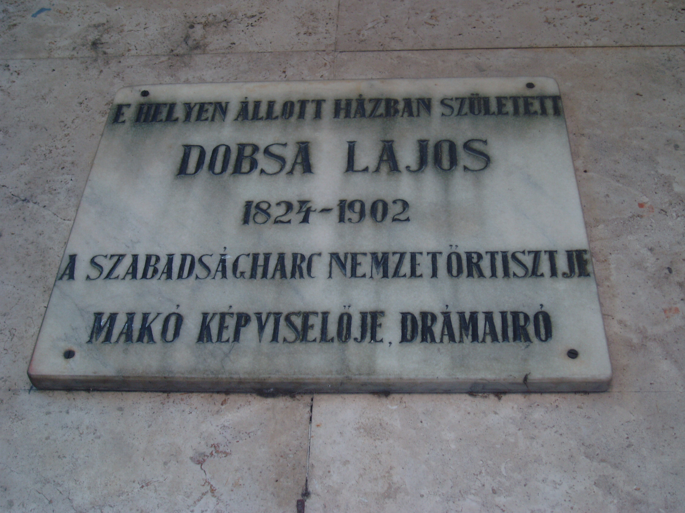 Nyilvános 1066 | 1711 | Makó, Széchenyi tér 13-15. | A Széchenyi teret déli oldalról az 1970-ben épült ún. csipkeházsor határolja, földszintjén üzletekkel. Rajta feliratos tábla idézi Dobsa Lajos (1824-1902) emlékét. A drámaíró, a szabadságharc nemzetőrtisztje, Makó képviselője az egykor itt állott házban született. Dobsa fordulatos életpályát járt be: végzett jogászként 1844-ben vándorszínésznek állt. Többször vendégszerepelt a Nemzeti Színházban, de nem szerződtették. 1846-ban nyugat-európai körútra indult. 1848-ban részt vett a párizsi forradalomban, amelynek hazai krónikása lett. Hazatérése után Radicalis álnéven újságíró, a szabadságharcban kormánybiztos, majd gerillakapitány. 1850-ben a Nemzeti Színházban egy vígjátékának bemutatóján elfogták és hathavi fogságra ítélték. 1874-ig Pesten élt, 1889-től szülővárosa képviselője volt. Miután hiába próbálta megszerezni a Nemzeti Színház intendánsi posztját, visszavonult az irodalmi élettől. 1848–1895 között 14 színpadi művet írt, több drámapályázat nyertese és jutalmazottja volt. I. István király című drámája lett a szövegkönyve Erkel Ferenc utolsó operájának. A fénykép 2007 júliusában készült. Felh. irod.: Barangolások Csongrád megyében. Miskolc, Well-PRess, 1997 Magyar színházművészeti lexikon. Bp. Akadémiai Kiadó, 1994 |