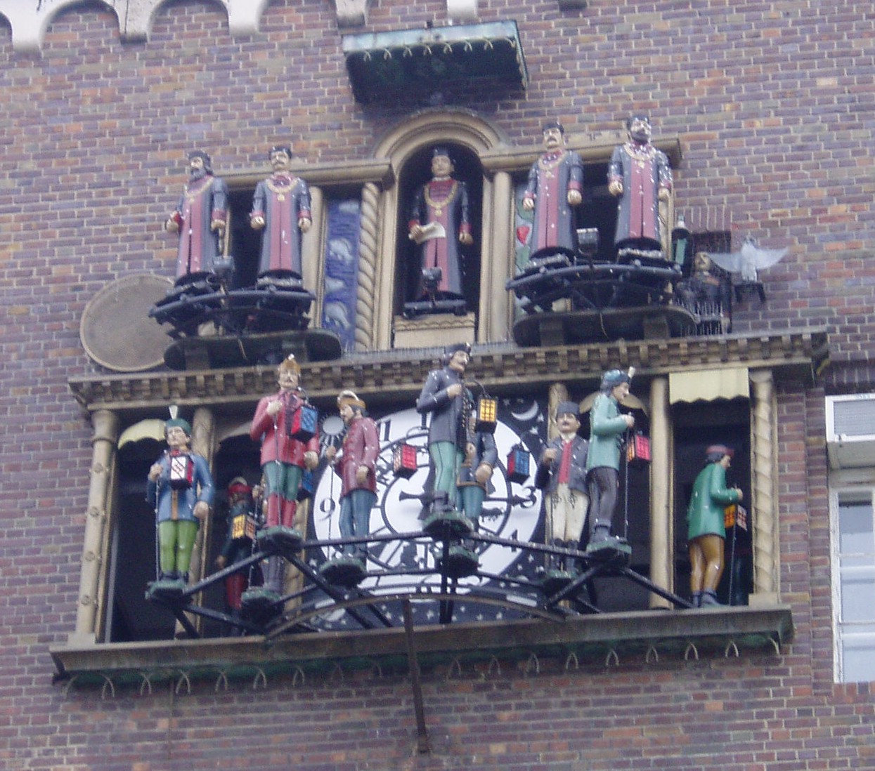 Nyilvános 1069 | 2278 | Szeged, Dóm tér: Zenélő óra | A Dóm teret körülvevő egyetemi épület déli homlokzatán látható a Magyarországon egyedülálló zenélő óra, a középkori egyetemek egyik jelképe, amelyet Csuri Ferenc (1893—1959) órásmester és Kállay József faszobrász készített 1935-ben. A számlap körüli falnyílásokon az egyetemi tanácsot és a ballagó diákokat ábrázoló színes figurák vonulnak ki a Vaszy Viktor által feldolgozott Gaudeamus igitur zenéjére. A szobrocskák olyan híres emberek arcvonásait viselik magukon, mint Klebelsberg Kunó — rektorként, Brassai Sámuel, Mikes Kelemen, Petőfi Sándor, Csokonai Vitéz Mihály, Kazinczy Ferenc és mások — mint diákok. A fénykép 2004 októberében készült. Felh. irod.: Péter László: Szeged. Bp. Panoráma, 1981 www.vendegvaro.hu |