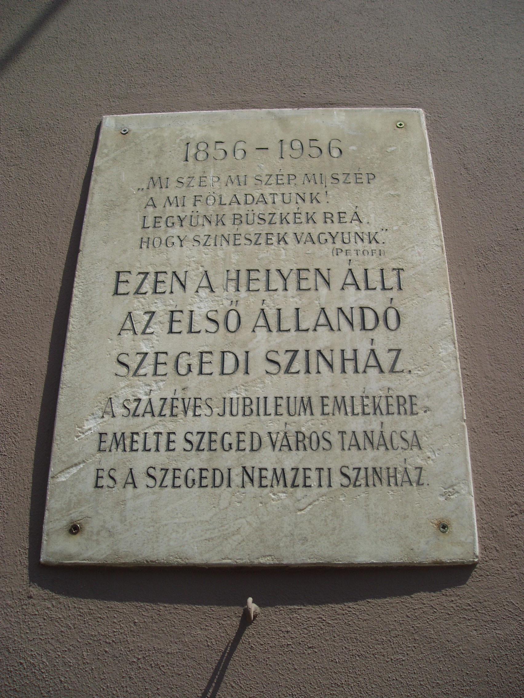 Nyilvános 1079 | 1583 | Szeged, Kelemen László utca 3. | Itt, a mai Hági étterem kerthelyiségének helyén állott Szeged első állandó, 1856-ban fából épült színháza, amelynek a Sörkert utcai homlokzaton állítottak emléktáblát. Az utcát az 1879-es árvízig Színház utcának is nevezték, ma pedig Kelemen László, az első magyar színigazgató nevét viseli, aki társulatával hosszabb ideig játszott Szegeden is (lásd: Szeged, Széchenyi tér 10.). Játszott itt Lendvay Márton, Szerdahelyi Kálmán, Prielle Kornélia. A színkör életében különösen emlékezetes volt az 1860/61-es évad, amelyet később a szegedi színjátszás aranykorának neveznek a színháztörténészek. Molnár György igazgató műsorpolitikáját egyfelől a közönség szórakoztatása, másfelől a haza iránti elkötelezettség határozza meg. A társulat megérkezésekor robbant ki a „kis forradalom”-nak nevezett tüntetéssorozat, amikor a szegediek a városháza előtt összegyűlve a betiltott Himnuszt, a Klapka– és Kossuth–indulókat énekelték a színészekkel együt, majd leverték az épületekről a császári címereket. A nagy árvízt követő újjáépítéssel szinte egyidőben határozta el a város, hogy méltó kőszínházat emel. A ma is álló épületet (lásd: Szeged, Deák Ferenc utca 12.) 1883-ban adták át rendeltetésének. A fénykép 2007 júliusában készült. Felh. irod.: Péter László: Szeged. Bp. Panoráma, 1981 Sándor János: A szegedi színjátszás krónikája. Szeged, Bába Kiadó, 2003 |