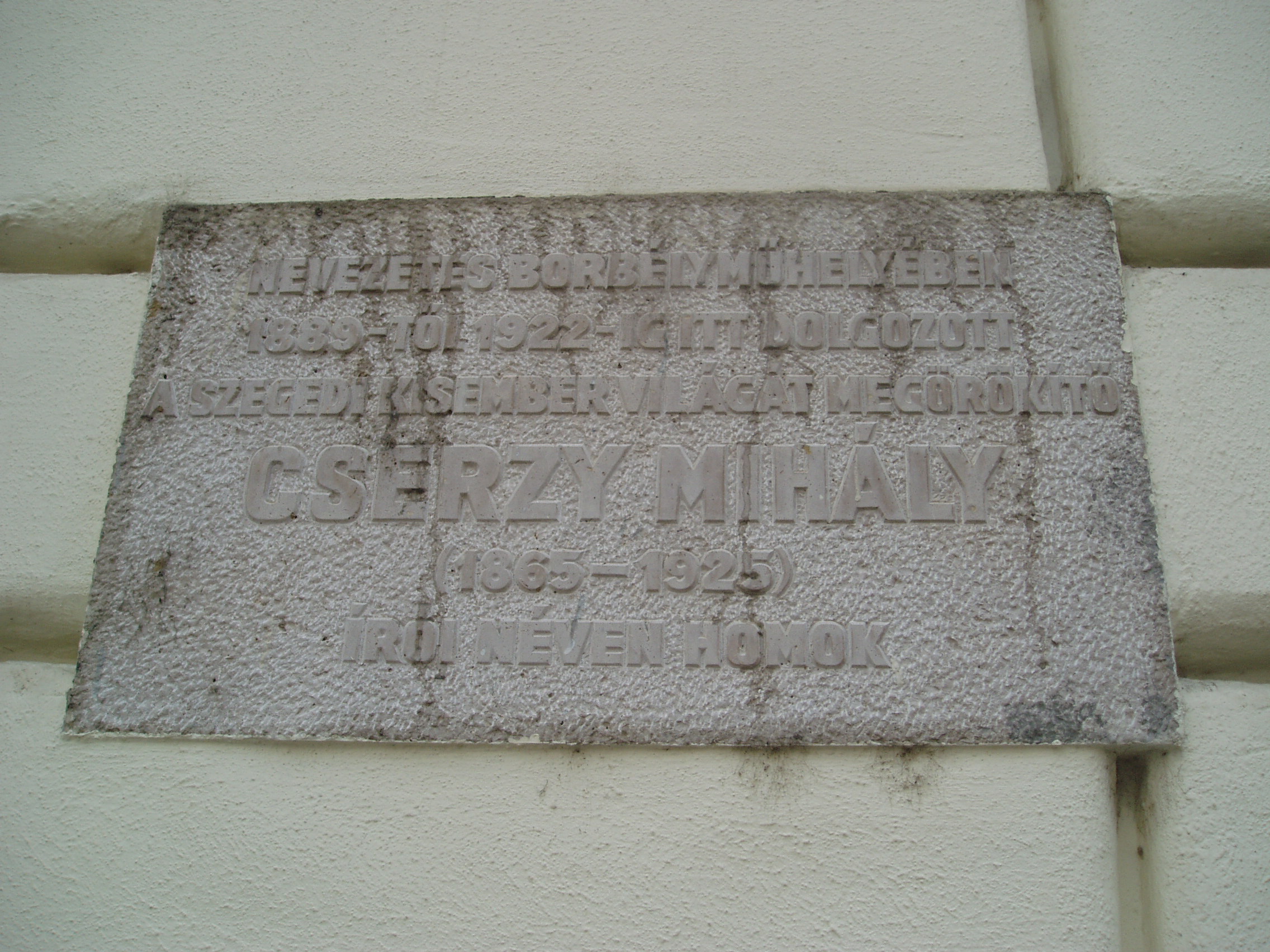 Nyilvános 1075 | 1511 | Szeged, Klauzál tér 1. Az új Zsótér-ház | A városi palota Kelemen László utcai oldalán volt Cserzy Mihály, a Homok álnéven publikáló országosan ismert író borbélyműhelye. Nemcsak a szegedi tanyák népének volt érzelmes hangú krónikása, hanem a városi szegénység életének is rokonszenvező, humanista ábrázolója. 1966 óta emléktábla hirdeti, hogy az írónak, aki hajlott koráig kitartott apjának mestersége, a fodrászat mellett, 1889-től 1922-ig itt volt a műhelye. A fénykép 2007 júliusában készült. Felh. irod.: Péter László: Szeged. Bp. Panoráma, 1981 |