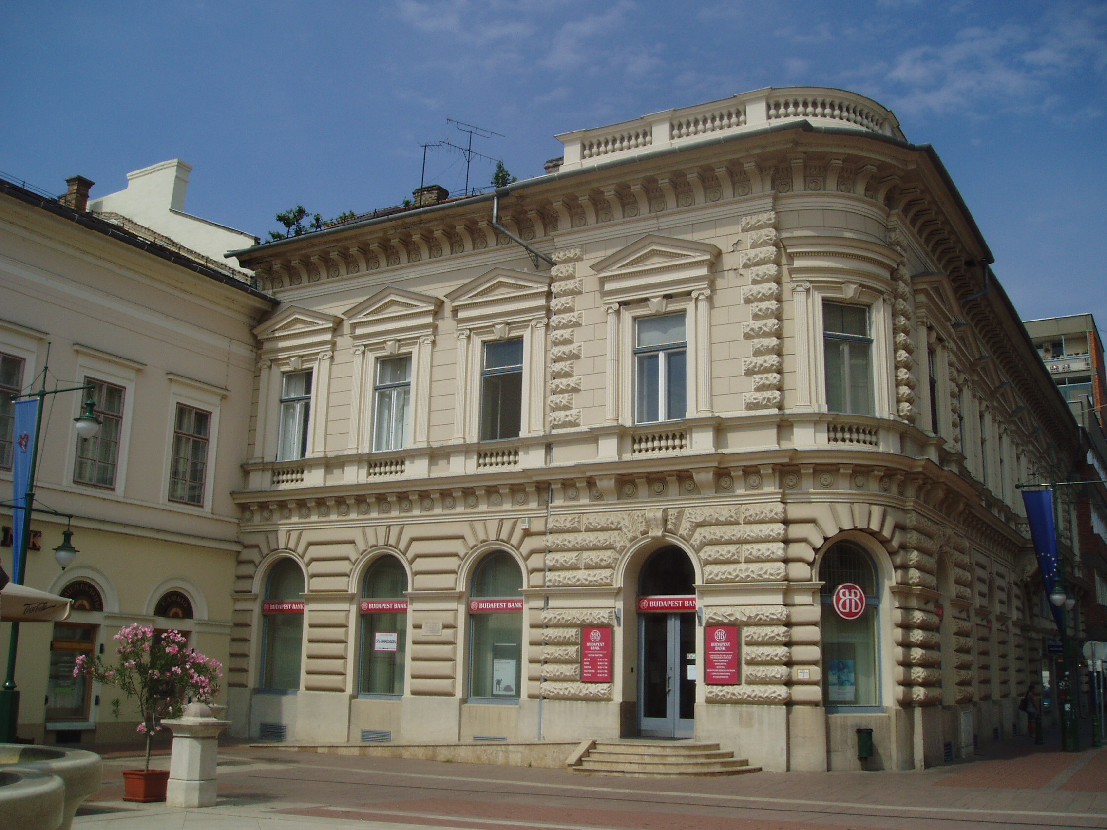 Nyilvános 1062 | 1454 | Szeged, Klauzál tér 4. | A tér nyugati oldalán kiszögellő eklektikus épületben hajdan híres kávéház működött. Tulajdonosa Ströbl József, Tömörkény István anyai nagybátyja volt. A fénykép 2007 júliusában készült. Felh. irod.: Péter László: Szeged. Bp. Panoráma, 1981 |