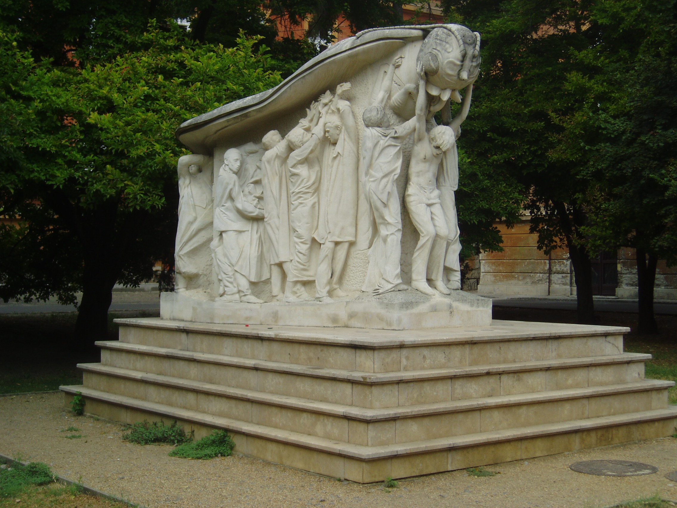 Nyilvános 1200 | 3111 | Szeged, Rerrich tér: Melocco Miklós 1956-os emlékműve | Szeged egyik legelzártabb terén, egy nagy oktatási épület és a Dóm tér között áll Melocco Miklós bolgár mészkőből faragott 1956-os emlékműve, amelyen egy óriás lepkét, a szabadság szimbólumát emelik magasba az 56-os forradalom vértanúi. Alkotója így vallott a szoborcsoportról: "A felnagyított rovarban van valami a szörnyből, hatalmas fej összetett szemekkel, pödörnyelvvel, erős rágókkal, ijesztő, mint egy tank. Nekem ez a szabadság lepkéje. De a Szabadság cserben hagyta a szabadságharcosokat. Voltaképpen uszító volt, felbujtó, pillanatokra mindenki érezte, mi ez, de beszélni már nem tudott róla, mert annyira gyorsan illanó dolog. Talán nem is létezik, mint az abszolút igazság. Mégis olyan toborzó erejűnek mutatkozott 1956-ban, hogy érdemes volt meghalni is érte. ... ... nem az úgynevezett sztárokat, a forradalom arisztokráciáját, Nagy Imrét, Malétert akartam ‘56-ból megörökíteni, mert az másmilyen szobrot követelt volna, hanem az utca népét, akiket magam is ismertem, ismerem. ... A szoborcsoportoknak nevet, fejezetcímeket, mint a regényekben szokás, nem adtam. De van benne szerelmes pár, vagy ember pár; van bajtárs, ahogy Komondi Sándor megragadja Csűrös Zoltánt, aki összeesik. Egy-egy arc több típust is képvisel. Van ott egy elegáns úr, aki visszafordulna, de a tömeg nem engedi. Börtönben is ült valamikor, de ő csak győztes akart lenni, nem hősi halott. A szobor hátsó részen ott fekszik Danner János alakja, akin átlépnek, mert nem veszik észre, hogy meghalt. Észrevétlenül vált halott hőssé. Nem volt sem időm, sem pénzem arra, hogy szót ejtsek a pocsék emberről, a gyáváról, aki elbújva várta ki a fejleményeket. Én csak a szépet akartam megmutatni..." A fénykép 2007 júliusában készült. Felh. irod.: Buka Adrienne: A szabadság pillangója. Melocco Miklós a szegedi '56-os emlékműről. = www.sulinet.hu |