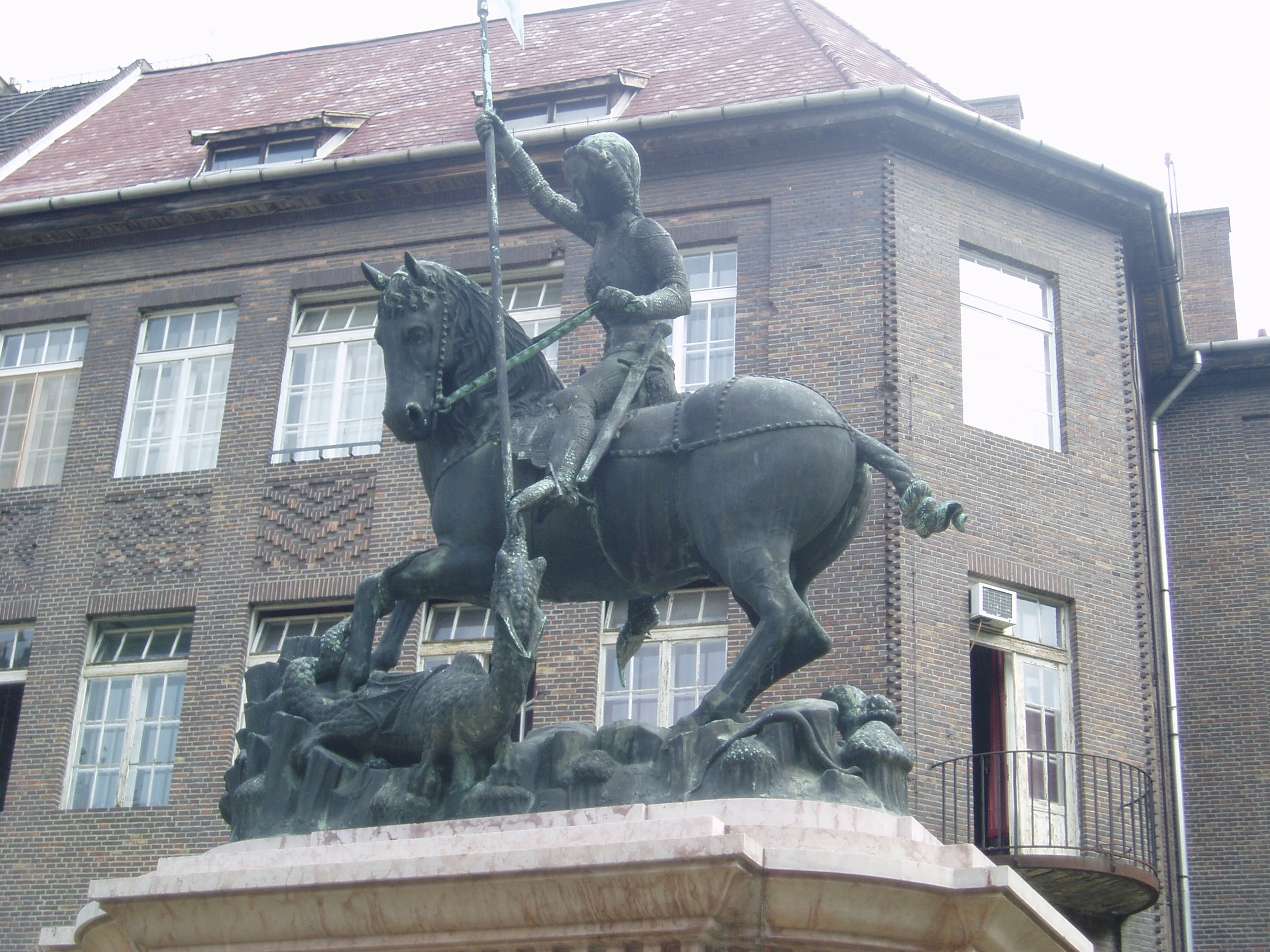 Nyilvános 1138 | 3047 | Szeged, Rerrich tér: Sárkányölő Szent György lovasszobra | A Dóm tőszomszédságában elhelyezkedő kis, intim hangulatú téren állították fel a Kolozsvári-testvérek 1373-ban készített, Szent Györgyöt ábrázoló lovasszobrának másolatát, amelyet Krausz Ferenc öntött 1938-ban Budapesten. A szobor, mely a városnak a nagyhírű kolozsvári egyetemhez való szellemi kötődését jelképezi, Klebelsberg Kunó kultuszminiszternek köszönhetően került Szegedre. Az eredeti műalkotás a prágai vár udvarán, a Hradzsinban látható. A fénykép 2007 júliusában készült. Felh. irod.: Péter László: Szeged. Bp. Panoráma, 1981 http://users.cwi.hu/idegenvezetes |