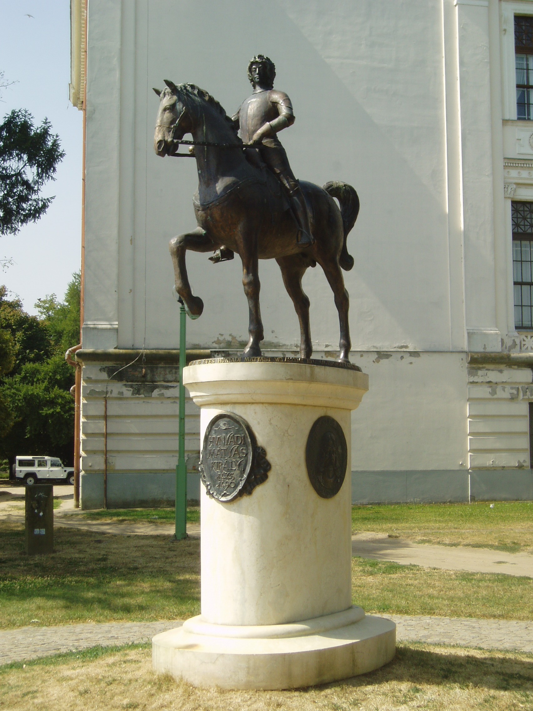 Nyilvános 1179 | 2424 | Szeged, Roosevelt tér: Mátyás király lovasszobra | A Közművelődési palota mögött, az árvízvédelmi fal kiszögellésénél, a Tisza-parton áll a 2001. augusztus 20-án átadott Hunyadi Mátyás lovasszobor, Lapis András alkotása. 1458-ban Szegeden egyeztek meg arról az ország főméltóságai, hogy a 15 éves Mátyást választják meg Magyarország királyának. A szobor talapzatának két oldalán Hunyadi János kormányzó (1407 k.–1456) és Hunyadi László (1431-1457) domborműve látható. A fénykép 2007 júliusában készült. http://users.cwi.hu/idegenvezetés |